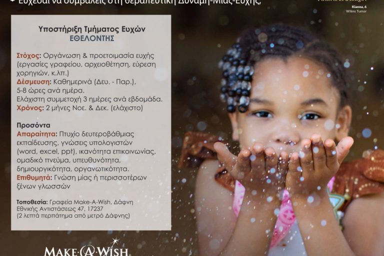Εύχεσαι να συμβάλεις στη θεραπευτική Δύναμη-Μίας-Ευχής; Δήλωσε τώρα συμμετοχή ως εθελοντής στο Make-A-Wish (Κάνε-Μια-Ευχή Ελλάδος) στην υποστήριξη Τμήματος Ευχών.