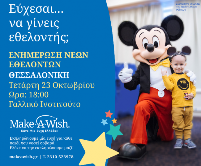 Στις 23 Οκτωβρίου 2019, η ομάδα του Κάνε-Μια-Ευχή Ελλάδος θα βρίσκεται στο Γαλλικό Ινστιτούτο για ενημέρωση νέων εθελοντών. Όσοι ενδιαφέρεστε να ενταχθείτε στο εθελοντικό δυναμικό του οργανισμού και να προσφέρετε δύναμη στα παιδιά που αγωνίζονται για τη ζωή τους, δεν έχετε παρά να δηλώσετε συμμετοχή.