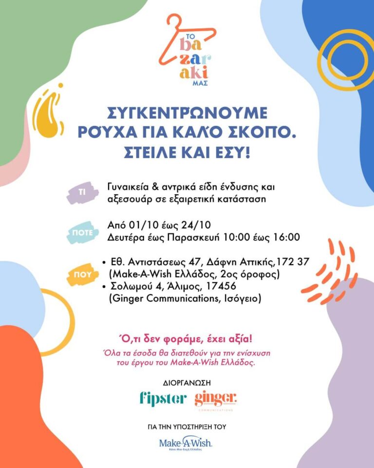 Το Bazaraki 2025 θα πραγματοποιηθεί από τις 19 έως τις 21 Δεκεμβρίου στο Ζάππειο Μέγαρο. Όλα τα έσοδα της διοργάνωσης θα διατεθούν για την ενίσχυση του έργου του Make-A-Wish Ελλάδος.