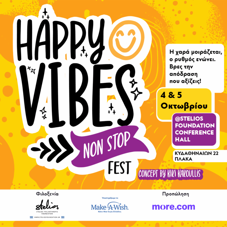 Το Happy Vibes Festival 2025 έρχεται στις 4 & 5 Οκτωβρίου στην καρδιά της Πλάκας, στο Stelios Foundation Conference Hall (Κυδαθηναίων 22, Αθήνα), για να δημιουργήσει ακριβώς αυτές τις στιγμές — γεμάτες ρυθμό, κίνηση, μουσική, έμπνευση και χαμόγελα για μικρούς και μεγάλους!