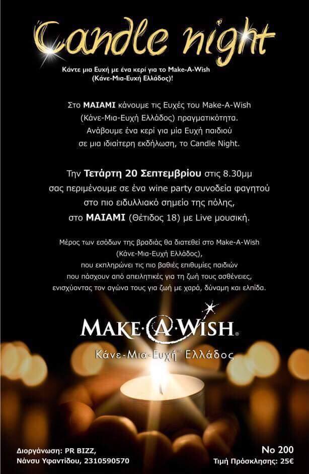Την Τετάρτη 20/09/2017, μετά τις 20.30, για 3η χρονιά στο MAIAMI, ανάβουμε ένα κερί για κάθε Ευχή παιδιού και το αφήνουμε το να ταξιδέψει στη θάλασσα.
