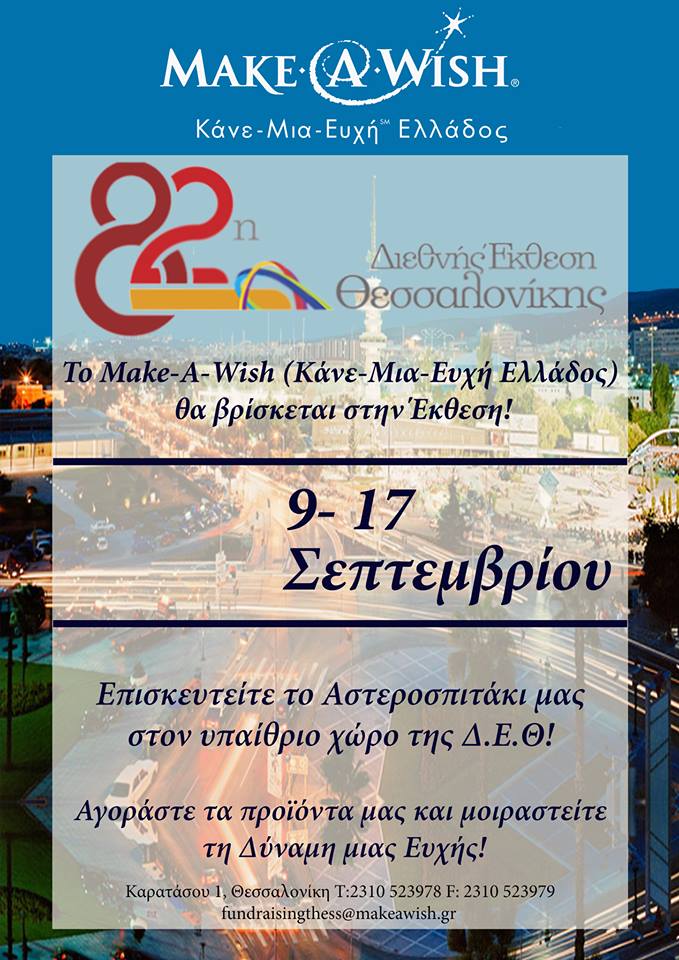 Το Make-A-Wish Greece (Κάνε-Μια-Ευχή Ελλάδος) συμμετέχει και φέτος στη 82η Διεθνής Έκθεση Θεσσαλονίκης.