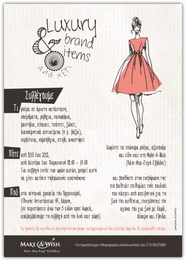 Για δεύτερη συνεχή χρονιά το Make-A-Wish (Κάνε-Μια-Ευχή Ελλάδος) θα διοργανώσει πριν τα Χριστούγεννα ένα bazaar pre-owned πολυτελών και επώνυμων ειδών, για την ενίσχυση του έργου του Οργανισμού.