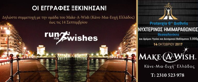 Το Make-A-Wish (Κάνε-Μια-Ευχή Ελλάδος) συμμετέχει με την ομάδα του στον 6ο Διεθνή Νυχτερινό Ημιμαραθώνιο Θεσσαλονίκης 2017 & Δρόμο Υγείας και Δυναμικού Βαδίσματος 5000 μ. το Σάββατο 14 Οκτωβρίου 2017.