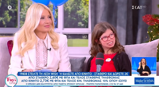 Στις 22 Δεκεμβρίου 2023, νεράιδες και ξωτικά του Make-A-Wish (Κάνε-Μια-Ευχή Ελλάδος) μαζί με οικογένειες παιδιών ευχής πλημμύρισαν το πλατό του Fay’s TIme και του ΣΚΑΪ. Η Φαίη Σκορδά καλωσόρισε τους τηλεθεατές στην τελευταία εκπομπή του χρόνου, που και φέτος ήταν αφιερωμένη στον οργανισμό. Μπείτε στο άρθρο και μάθετε περισσότερα!