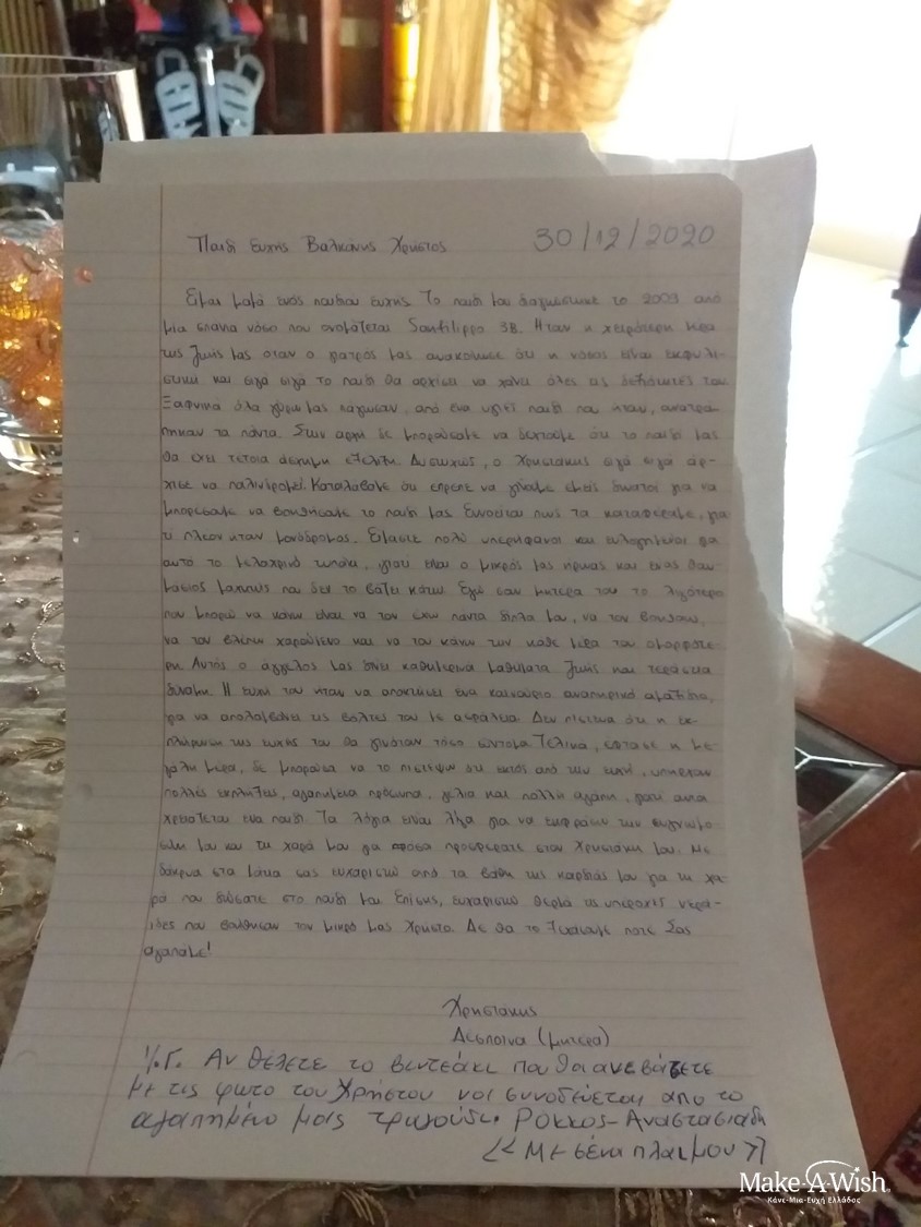 Η ευχή του ήταν να αποκτήσει ένα καινούριο αναπηρικό αμαξίδιο, για να απολαμβάνει τις βόλτες του με ασφάλεια. Δεν πίστευα ότι η εκπλήρωση της ευχής του θα γινόταν τόσο σύντομα. Τελικά, όταν έφτασε η μεγάλη μέρα, δε μπορούσα να πιστέψω ότι εκτός από την ευχή, υπήρχαν πολλές άλλες εκπλήξεις, αγαπημένα πρόσωπα, γέλια και πολλή αγάπη. Αυτά που χρειάζεται ένα παιδί. Τα λόγια είναι λίγα για να εκφράσω την ευγνωμοσύνη μου και τη χαρά μου για τα όσα προσφέρατε στον Χρηστάκη μου. Με δάκρυα στα μάτια σας ευχαριστώ από τα βάθη της καρδιάς μου για τη χαρά που δώσατε στο παιδί μου.