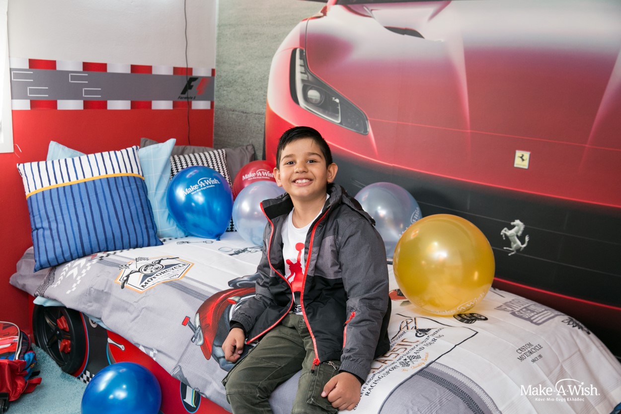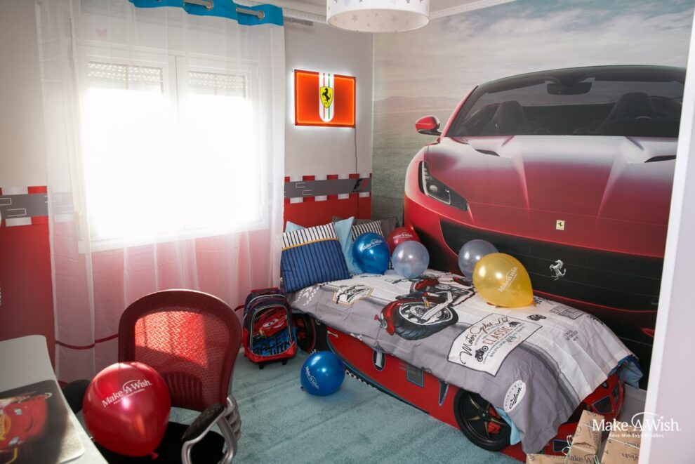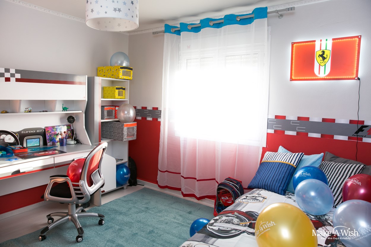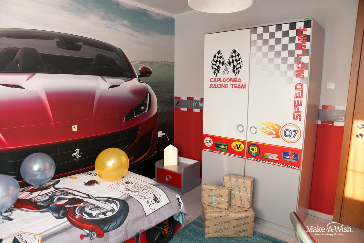 Όμως οι νεράιδες χρησιμοποίησαν την πολύτιμη νεραϊδόσκονη τους ώστε το αποτέλεσμα να είναι ακόμα πιο μαγικό. Μια γιγάντια, κατακόκκινη Ferrari διακοσμούσε τον τοίχο πάνω από το κρεβάτι του. Τοίχοι βαμμένοι στα χρώματα της Formula και έπιπλα βγαλμένα από αγώνες! Κάθε λεπτομέρεια ήταν φροντισμένη στην εντέλεια, με την καρέκλα να θυμίζει κάθισμα αγωνιστικού αυτοκινήτου και το φωτιζόμενο σήμα του αγαπημένου του αυτοκινήτου πάνω από το κεφαλάρι του κρεβατιού!