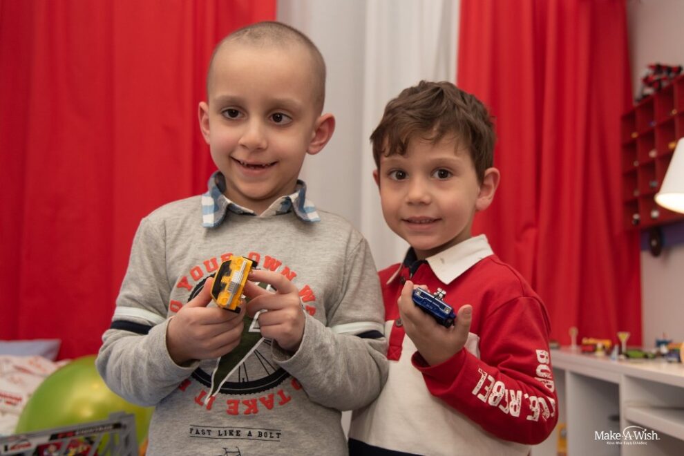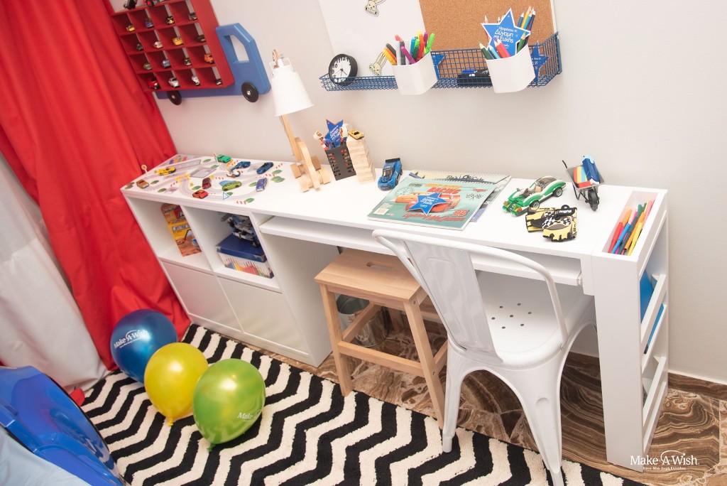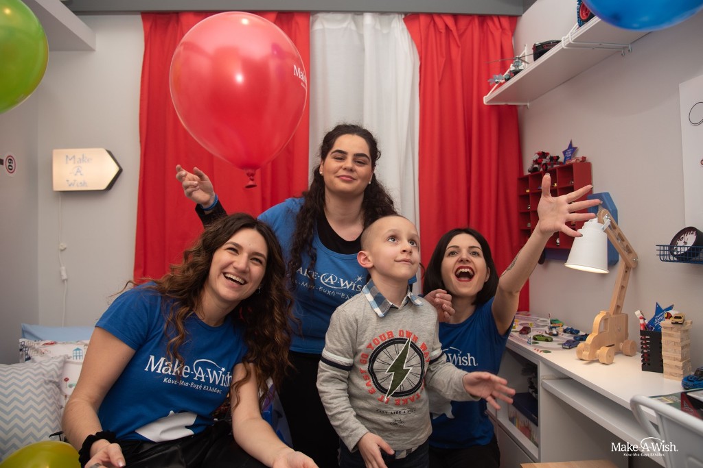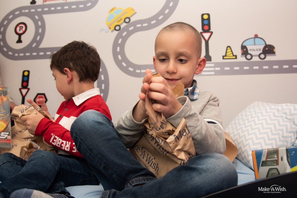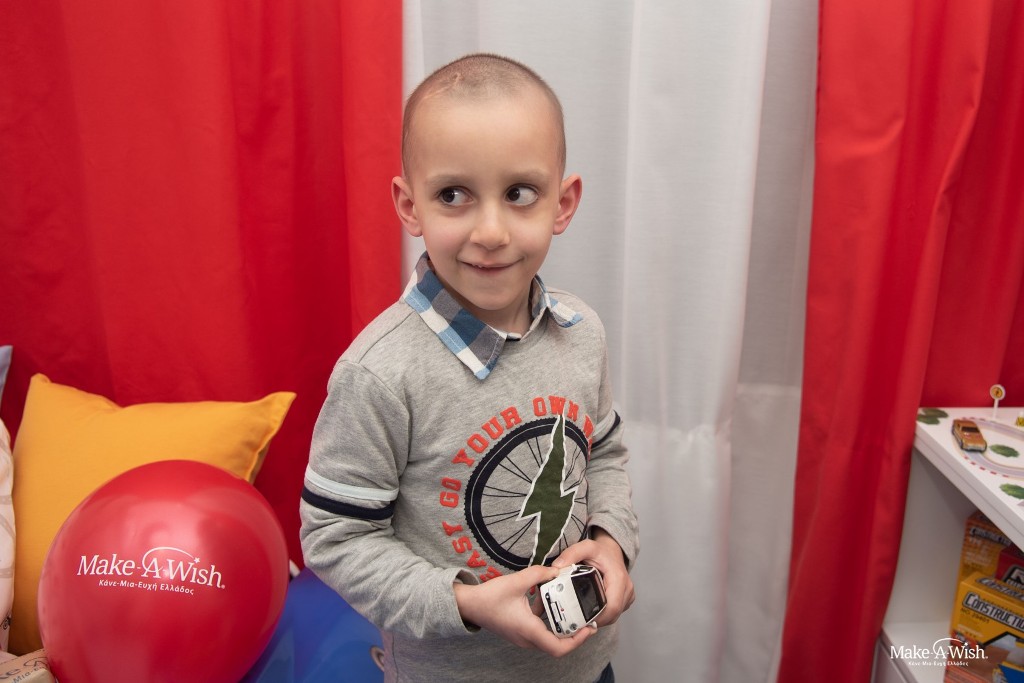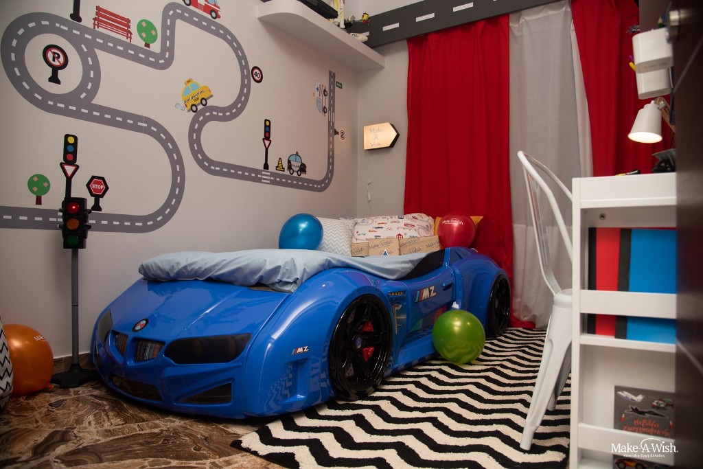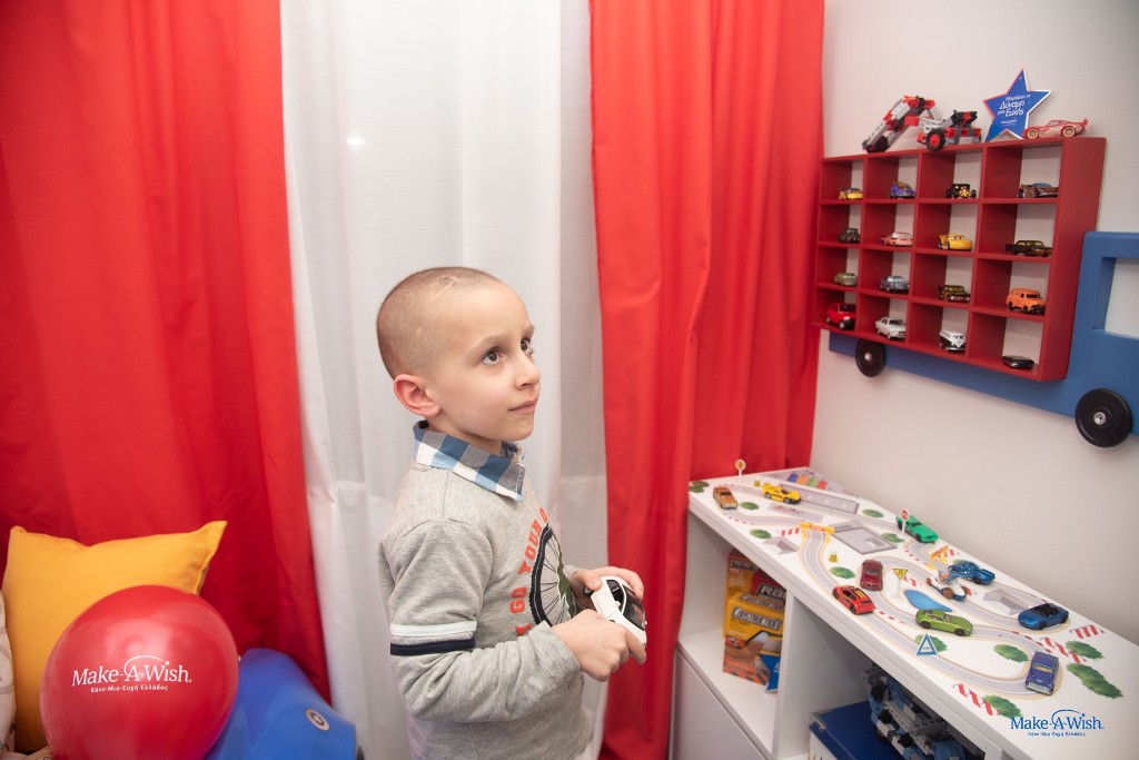Ο Κωνσταντίνος μας, παρόλο που είναι μόλις 6, έχει απίστευτες γνώσεις σε ό,τι αφορά τα οχήματα: αυτοκίνητα, φορτηγά, πυροσβεστικά, ελικόπτερα, αγωνιστικά! Στις συναντήσεις μας, μας έδειξε με υπερηφάνεια τη μεγάλη συλλογή του από αυτοκινητάκια, πίστες, και πολλά ακόμη. Γι’ αυτό και η ευχή του δεν εξέπληξε κανέναν: ένα δωμάτιο με θέμα τα αυτοκίνητα! Όταν τον ρωτήσαμε για το πώς φαντάζεται το δωμάτιό του, ένα πράγμα είχε τη μεγαλύτερη σημασία. Το κρεβάτι BMW σε μπλε χρώμα που είχε ήδη με τη βοήθεια της μαμάς του σε φωτογραφία, για να μας το δείξει!