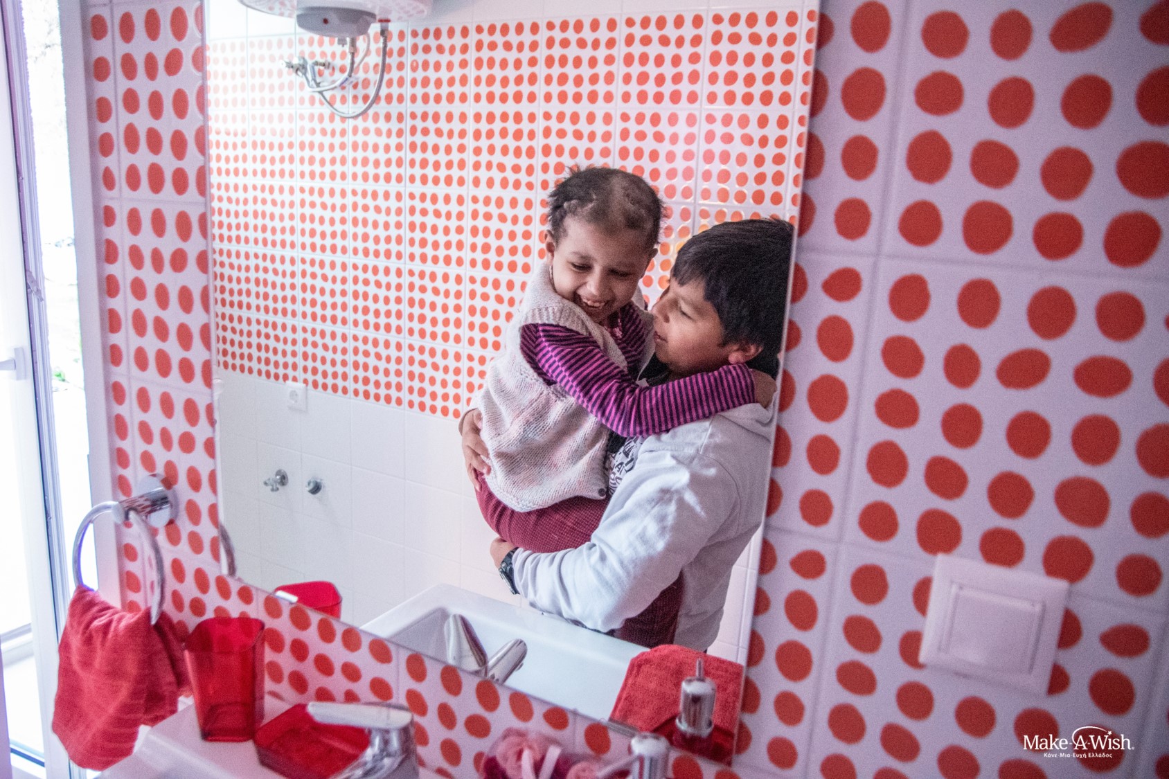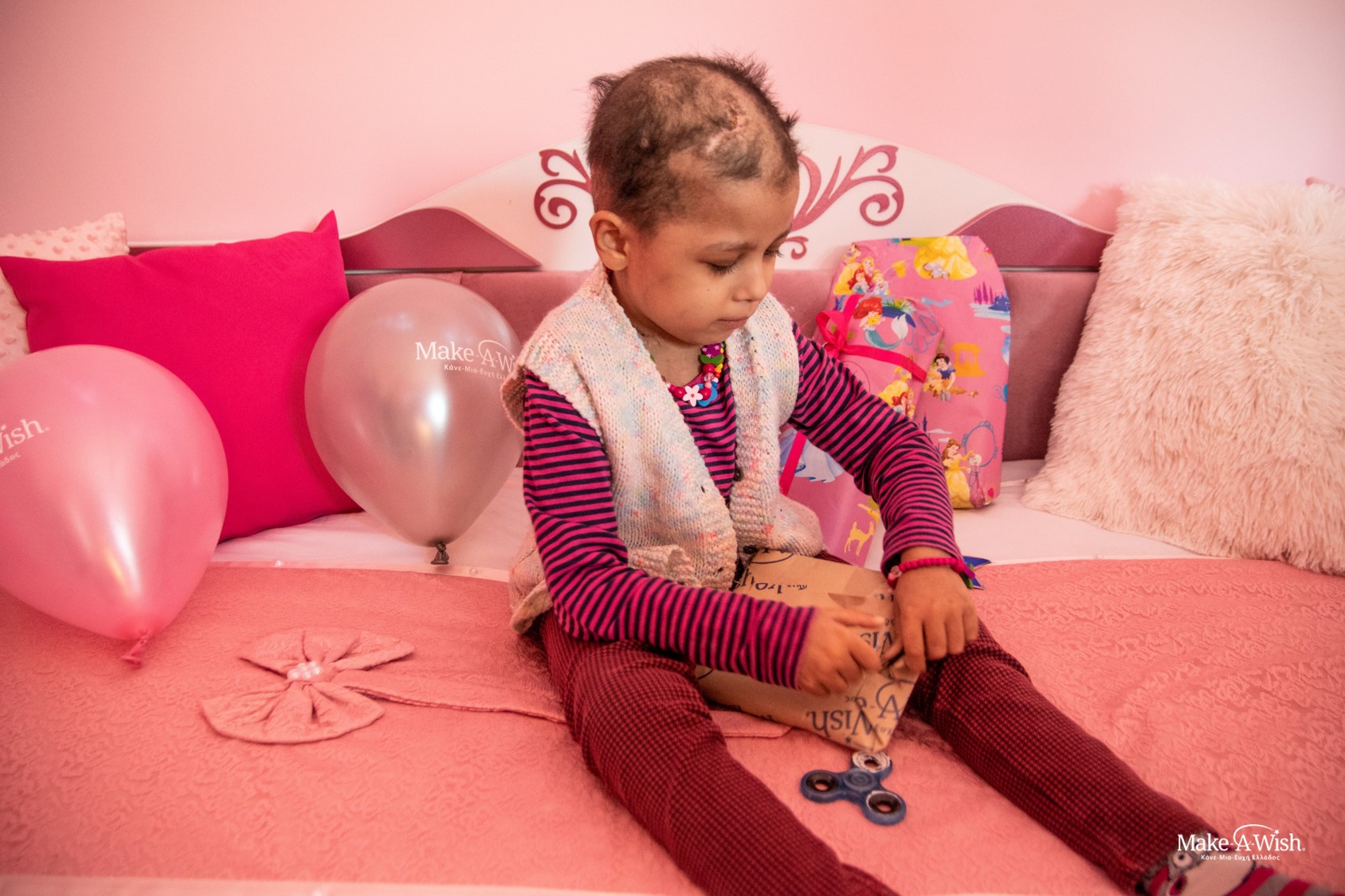 Και η πόρτα του δωματίου άνοιξε και η μικρή μας αντίκρισε με έκπληξη και θαυμασμό τον καινούριο κόσμο που ανοιγόταν μπροστά της, το καινούριο δωμάτιο που θα έδινε χρώμα και χαρά στην καθημερινότητα της. Ένα όμορφο διάπλατο χαμόγελο σκιαγραφήθηκε στο πρόσωπό της και δε σβήστηκε στιγμή, ήταν εκεί και δήλωνε κάθε λεπτό την ευτυχία της. Τα λόγια ήταν περιττά, έτσι η ελάχιστη ομιλητικότητά της δεν μας εμπόδισε να καταλάβουμε τον ενθουσιασμό της. Σε όλη τη διάρκεια της ευχής δε θέλησε να μετακινηθεί από το καινούριο κρεβάτι της, ενώ ταυτόχρονα άνοιγε τα δώρα της με ανυπομονησία. Το μεγάλο αυτοκόλλητο της Barbie που διακοσμούσε τον τοίχο της, οι κούκλες και τα μικρά δωράκια ήταν μερικά από τα αντικείμενα που κέντρισαν το ενδιαφέρον της Γιαμούρ. Επικοινωνούσε μαζί μας γνέφοντας με το κεφαλάκι της και χαμογελώντας συνεχώς. Η μητέρα της, άγρυπνος φρουρός και προστάτης, δεν την άφησε από την αγκαλιά της και με τον δικό τους κώδικα επικοινωνίας, μας εξηγούσε όσα εμείς δεν καταλαβαίναμε.
