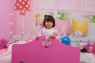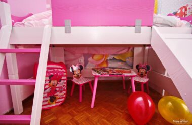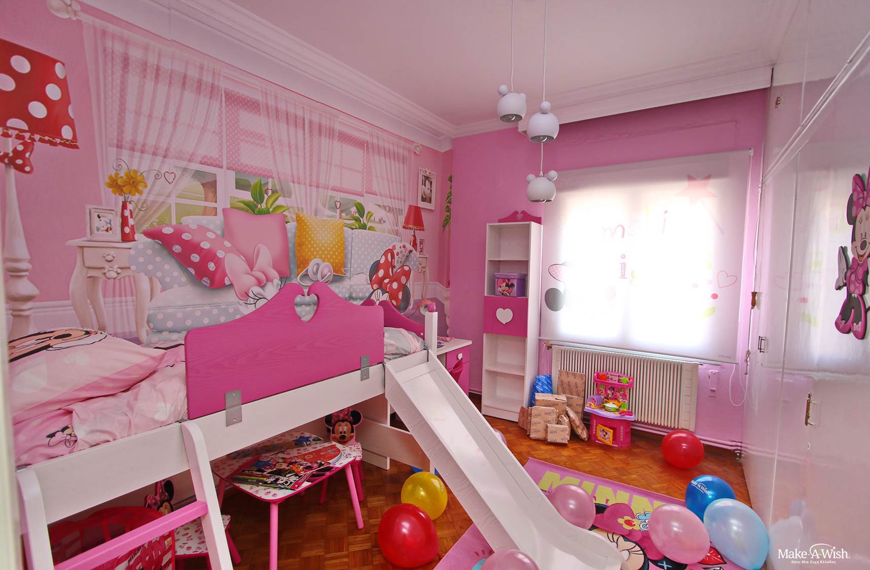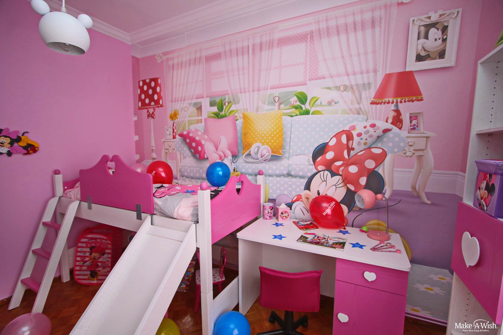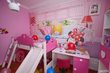 Η Βικτωρία είναι ένα τόσο δα χαμογελαστό πλασματάκι, ιδιαίτερα ζωηρό και υπερκινητικό, που λατρεύει τη Minnie! Όσες φορές τη συναντήσαμε, ήταν τόσο έκδηλη η αγάπη της για τη Minnie Mouse, ώστε δεν υπήρξε καμία αμφιβολία ότι αυτό που θα ήθελε περισσότερο θα ήταν να κοιμάται και να ξυπνάει μέσα στον κόσμο της. «Θέλω και κρεβάτι με τσουλήθρα!», μας είπε με τόνο που δε χωρούσε αμφισβήτηση. Η επιθυμία της διαταγή μας, λοιπόν, και δουλέψαμε πυρετωδώς για να ετοιμάσουμε το βασίλειο της Minnie για τη μικρή Βικτωρία!