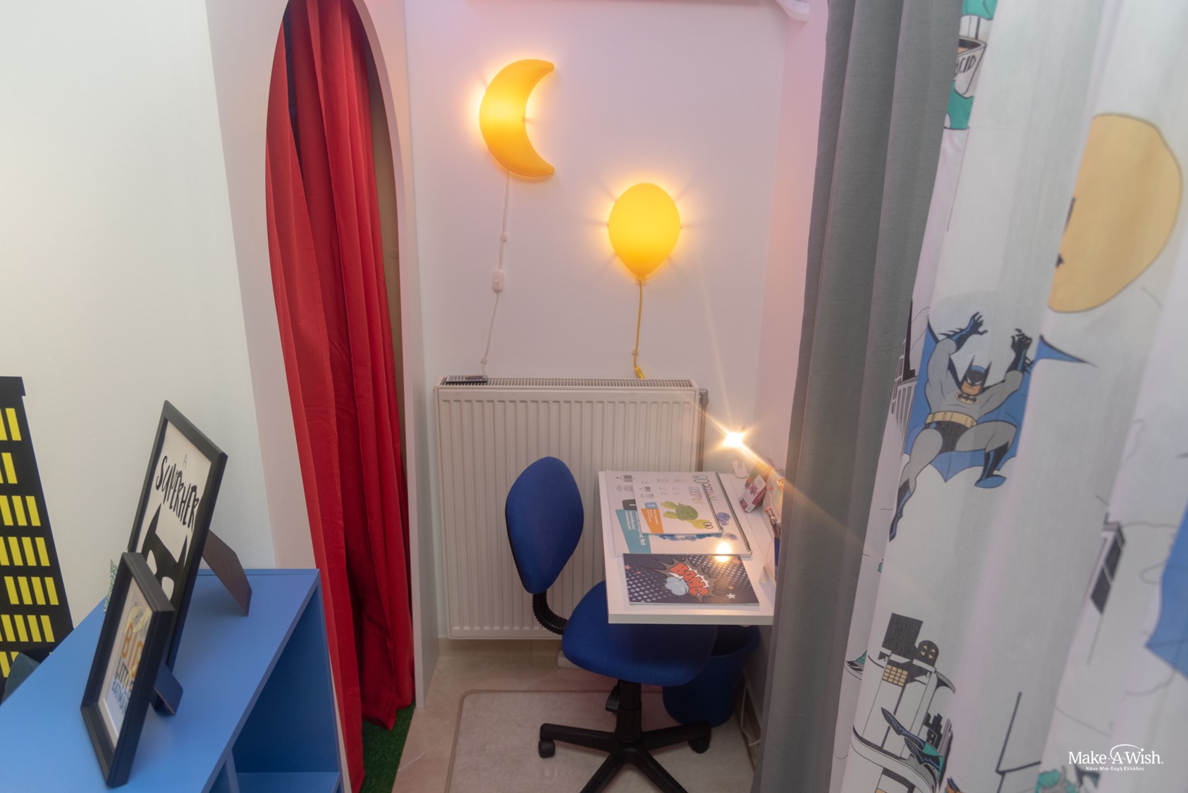 Αδυνατούσε να επιλέξει ποιοι ήρωες θα τον συντρόφευαν, αφού λατρεύει την παρέα του Mickey Mouse, αλλά τον εντυπωσιάζει εξίσου το δυναμικό δίδυμο Batman & Robin. Οι νεράιδες το σκέφτηκαν πολύ καλά… δεν γινόταν να στερήσουν από τον Θ. όσα ήθελε, όσο «ασυμβίβαστα» κι αν μοιάζουν στο μάτι… Για αυτό και μοίρασαν το δωμάτιο στα δύο, ώστε ο μικρός μας ήρωας να κοιμάται ήρεμος στη Gotham City, όσο δρουν ο Batman με τον Robin ενάντια στο κακό, και να απολαμβάνει το παιχνίδι με την παρέα του Mickey Mouse στην πολύχρωμη κρυψώνα τους.