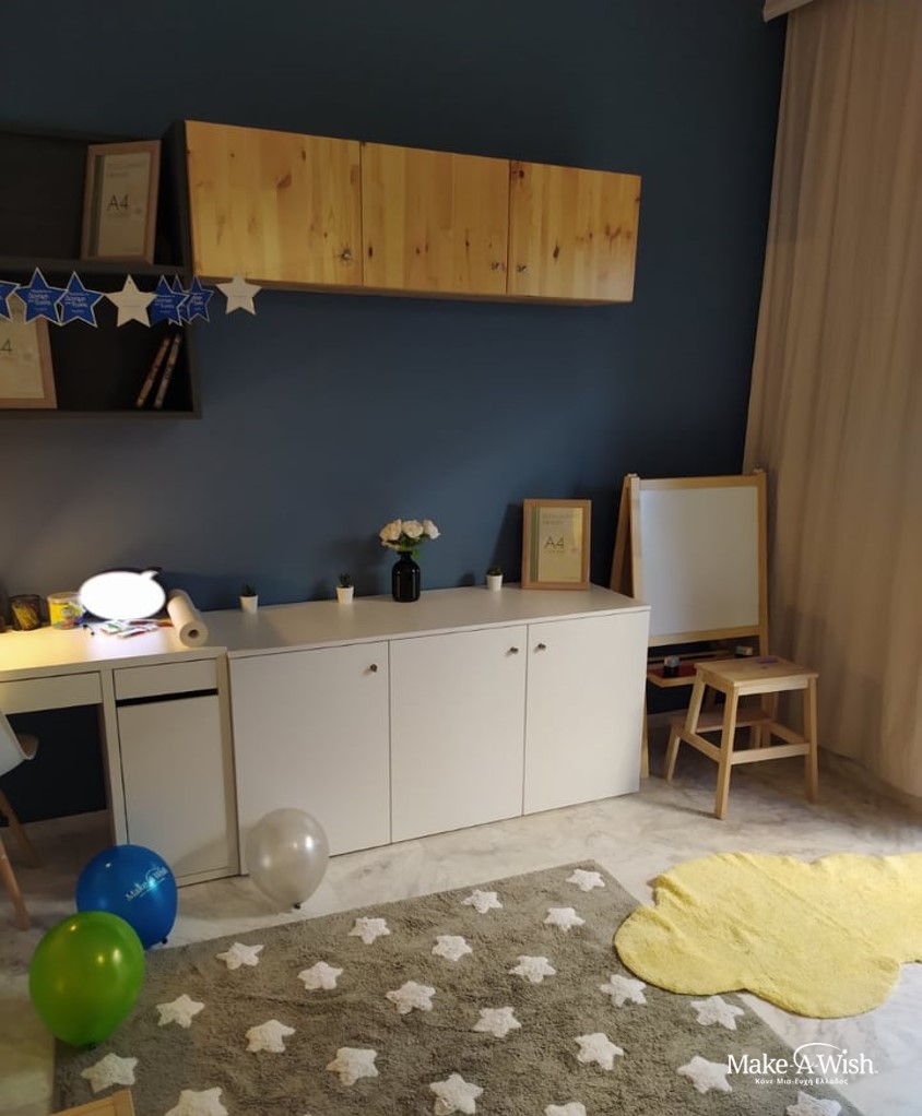 Είναι γεμάτος όρεξη για παιχνίδια και σκανδαλιάρικες ζαβολιές, αλλά και πολλή, μα πολλή ζωγραφική! Μαρκαδόροι, ξυλομπογιές, παστέλ είναι κυριολεκτικά προεκτάσεις των μικρών χεριών του. Πραγματικά τη λατρεύει! Περίμενε την ημέρα της εκπλήρωσης της ευχής του πώς και πώς. Είχε πολύ μεγάλη αγωνία και ρώταγε συνέχεια «πότε θα μου φέρει η νεράιδα το καινούριο δωμάτιο;». Η ευχή του όμως δεν άργησε καθόλου να γίνει πραγματικότητα!