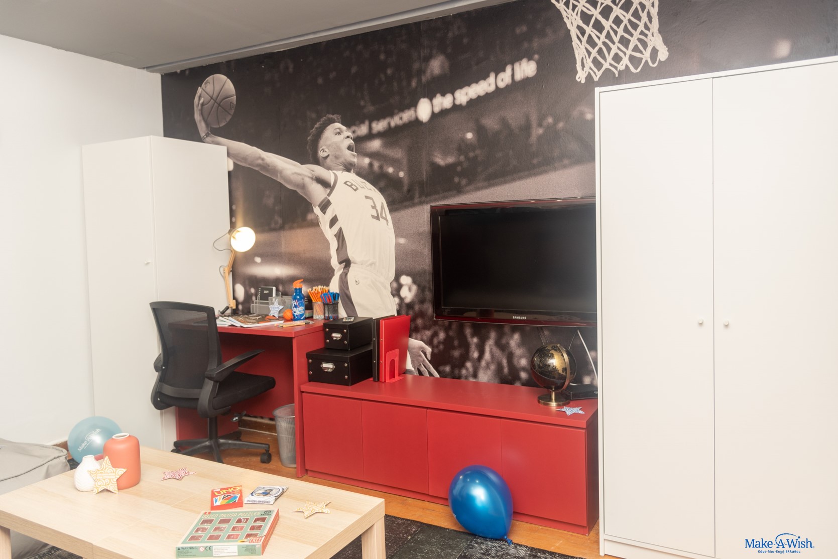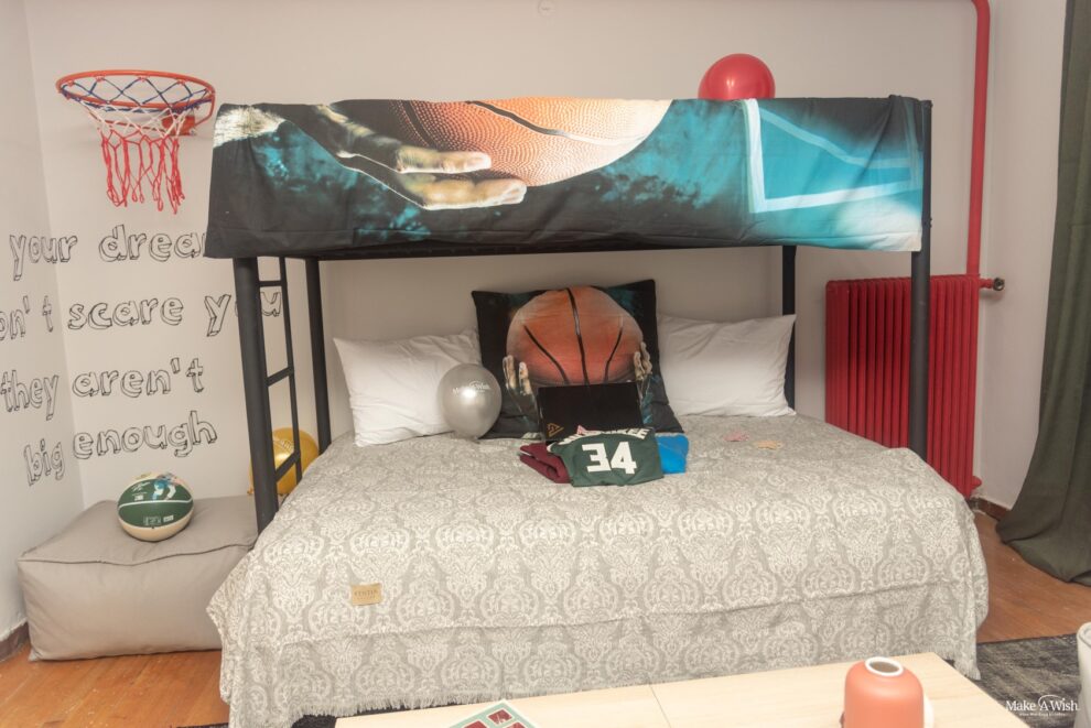 Το δωμάτιό του ήταν κάτι που άρχισε να προετοιμάζεται εβδομάδες πριν, αλλά τελικά μπόρεσε να ολοκληρωθεί στους χρόνους που είχαμε υπολογίσει όλοι. Την ημέρα της εκπλήρωσης της ευχής, ο Μ. μας ήταν απομονωμένος σε άλλο δωμάτιο του σπιτιού, για να μη χαλάσει η έκπληξη. Η μαμά του ήταν η κατάσκοπός μας, και μας ενημέρωνε για το καθετί. ΌΛΑ ήταν έτοιμα και περίμεναν με αγωνία το παιδί μας για να μπει και επιτέλους να το δει!