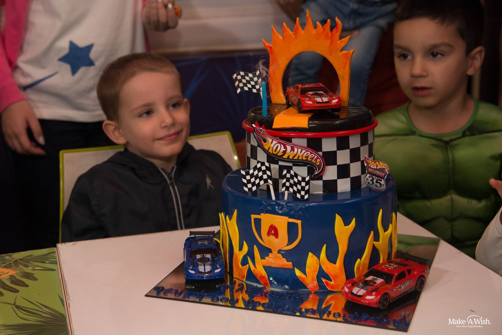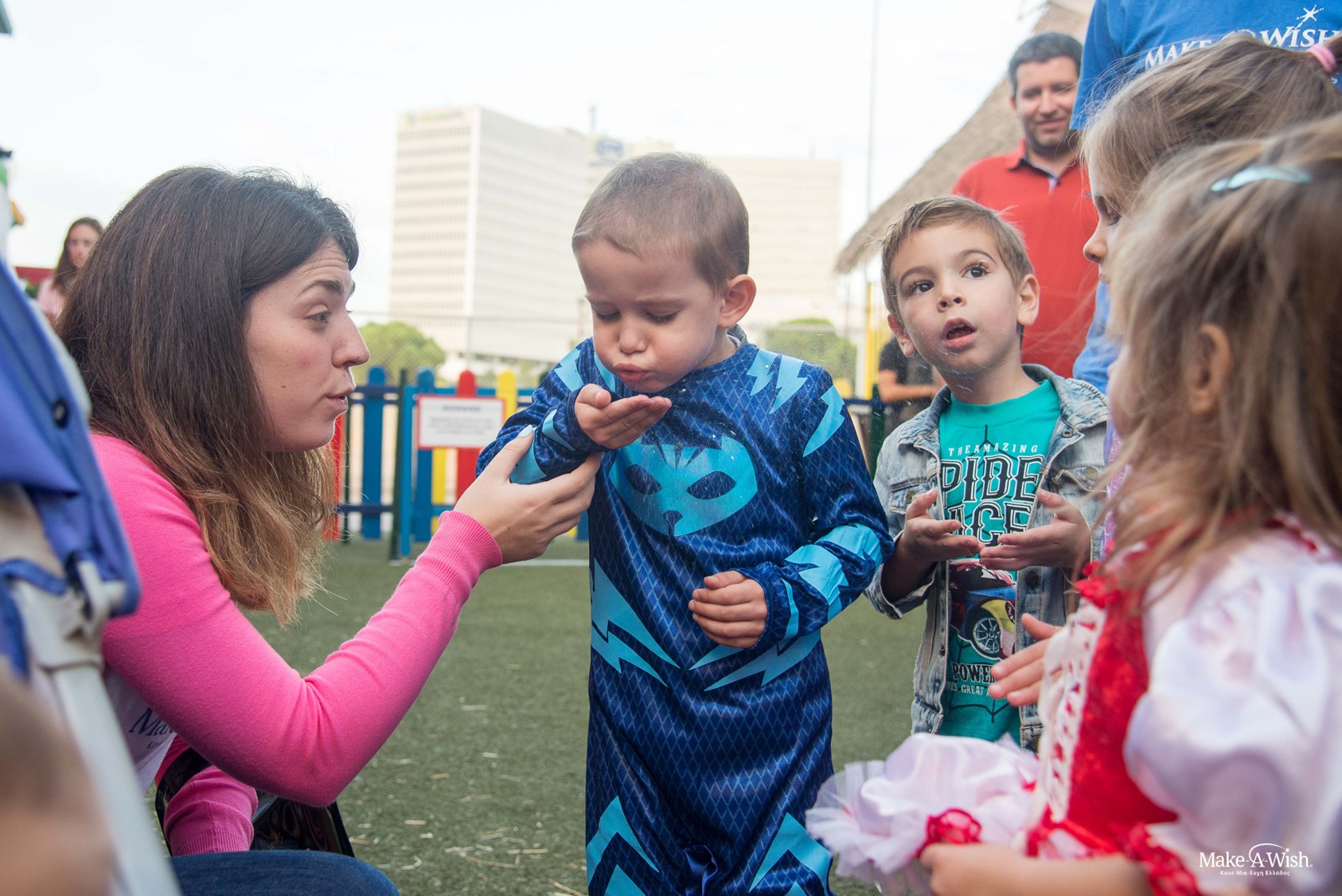 Την ημέρα της ευχής του είχε κατέβει από νωρίς στην αυλή, ντυμένος με τη στολή του catboy από τους πυτζαμοήρωες, και μας περίμενε με τους γονείς του έτοιμος για παιχνίδι. Δεν ήξερε όμως που θα πάμε, ούτε πόσες εκπλήξεις τον περίμεναν εκεί. Σε όλη τη διαδρομή δεν σταμάτησε να μιλάει για το τι του αρέσει να κάνει και το πόσο πολύ αγαπάει την οικογένεια του και τους φίλους του. Με το που ξεπρόβαλε το λούνα παρκ άρχισε να υποψιάζεται ότι η μέρα έχει πολύ παιχνίδι, γέλιο και χοροπηδητά στο πρόγραμμα. Δεν υποψιαζόταν ότι τον περίμενε μια ακόμα έκπληξη: όλοι του οι φίλοι και τα ξαδέρφια του ήταν εκεί για να μοιραστούν μαζί αυτή την παιχνιδιάρικη ημέρα. Ο Αλέξανδρος αφέθηκε σε ένα κύμα από αγκαλιές, φωνές και φιλιά! Η έναρξη του παιχνιδιού και του κυνηγιού του θησαυρού σηματοδοτήθηκε με ένα φύσημα μαγικής νεραιδόσκονης που εξαπλώθηκε παντού! Τα παιδιά διασκορπίστηκαν στα φουσκωτά και τις τσουλήθρες, ξεπηδούσαν μέσα από τα παιχνίδια, ανεβοκατέβαιναν στα τρενάκια και στα συγκρουόμενα, έπαιζαν χαρούμενα και ανέμελα. Οι νεράιδες είχαν ετοιμάσει ένα ξεχωριστό κυνήγι θησαυρού. Έτσι γεμάτοι ενθουσιασμό κινήσαμε για το τρενάκι κάμπια, όπου ο Αλέξανδρος θα ξεκίναγε την αναζήτηση των παιχνιδιών που είχαμε κρύψει. Οι καλεσμένοι του Αλέξανδρου ανέβηκαν στην κάμπια και οι φωνές και τα γέλια δεν είχαν τελειωμό. Την πιο καλή ψαριά την έκανε ο Αλέξανδρος στο παιχνίδι με τα ψαράκια, αφού με το ψάρι του «τσίμπησε» και την πίστα Cars. Με κάθε δώρο που ξετύλιγε με την παρέα του, ανακάλυπτε και από ένα παιχνίδι, και ένα πελώριο χαμόγελο ζωγραφίζονταν ευθύς στο προσωπάκι του. Κανείς δεν μπορούσε να συλλογιστεί την απέραντη ευτυχία που κατέκλυζε τον Αλέξανδρο. Είναι αυτή η παιδική αθωότητα που κάτι μικρό γεμίζει τα παιδιά φως, χαρά και ενέργεια. Και είναι η εκπλήρωση μιας ευχής, που τα γεμίζει πίστη και σιγουριά. Ο Αλέξανδρος άνοιγε με τον ίδιο ενθουσιασμό ένα – ένα τα δώρα και συνέχεια ρώταγε έκπληκτος από χαρά: «Και αυτό για εμένα είναι;». Ο χώρος γέμισε μικρά και μεγάλα αυτοκινητάκια, φορτηγά και άλλα οχήματα. Μόλις ξετύλιξε το τελευταίο δώρο, δεν έβλεπε την ώρα να επιστρέψουν στο σπίτι για να μπορέσει να στήσει τις πίστες και να παίξει με τον καινούριο του στόλο. Η μητέρα του Αλέξανδρου μας είπε πως ξενύχτισαν μαζί με τον πατέρα του για να τα στήσουν και να τα βρει έτοιμα το πρωί μόλις ξυπνήσει για να παίξει. Μάλιστα, το βράδυ τον άκουσαν που παραμιλούσε μες στον ύπνο του και έλεγε «πίστες, πίστες».