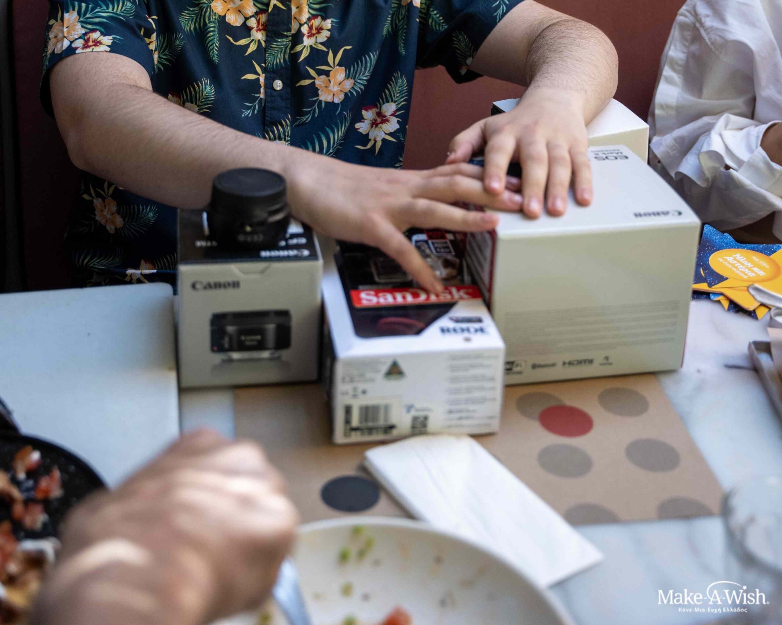 Μετά το Μουσείο Αυτοκινήτου, κατευθύνθηκαν σε μία πολύ όμορφη αυλή, για να γευματίσουν. Εκεί τον περίμενε μια ακόμη έκπληξη… Του σέρβιραν ένα κουτί για γλυκά, όμως μέσα αντί για τούρτα, βρήκε την κάμερα που είχε ευχηθεί να αποκτήσει! Τα μάτια του έλαμπαν και το χαμόγελό του φώτιζε ολόκληρο το πρόσωπό του. Η μητέρα του, φανερά συγκινημένη, δεν σταματούσε να μας ευχαριστεί, βλέποντας το παιδί της να λάμπει από χαρά.