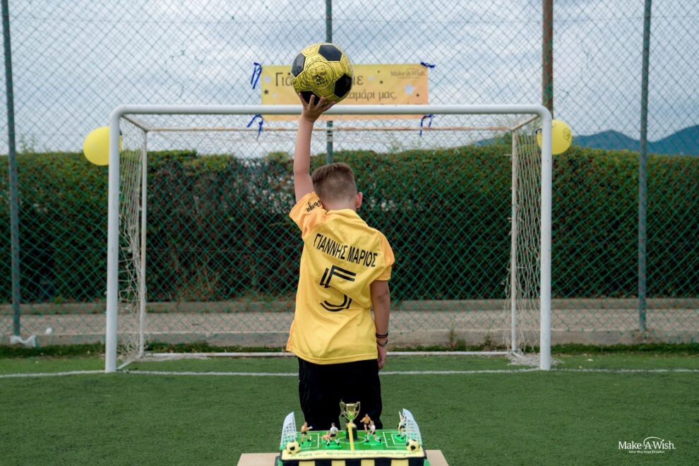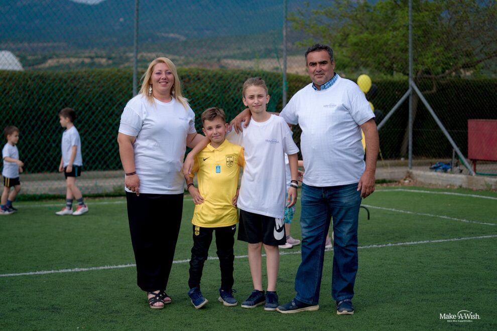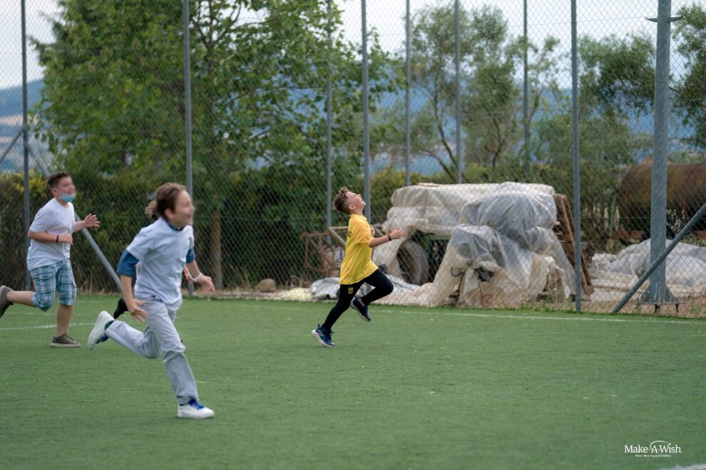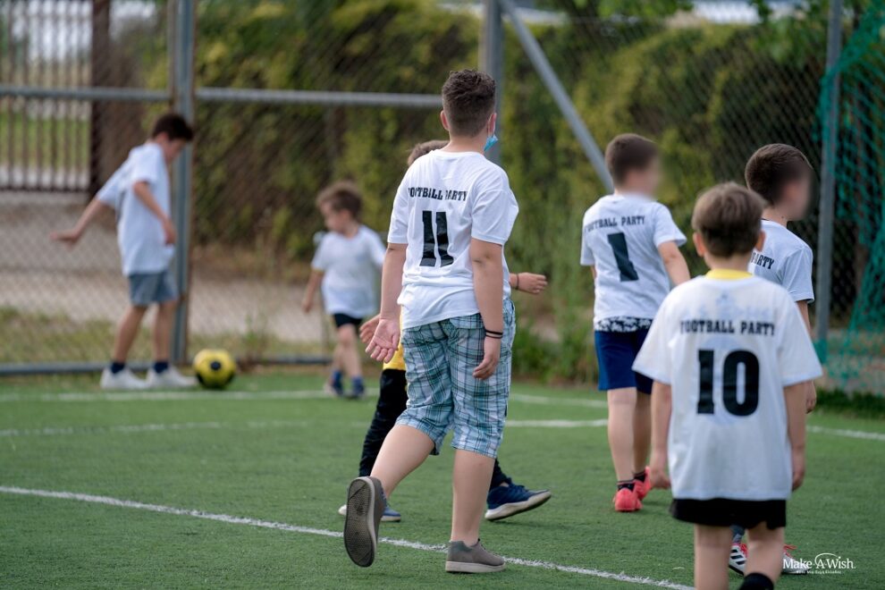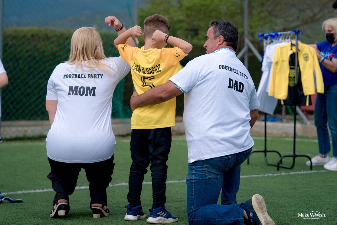 Πρώτος – πρώτος ο Γιάννης-Μάριος φόρεσε την μπλούζα από την στολή με το όνομα του και το νούμερο 5 στην φανέλα του. Οι εθελοντές μας, μοίρασαν στους φίλους του τα μπλουζάκια τους. Μαζί με τα παιδιά μπλουζάκια φόρεσαν και ο μπαμπάς και η μαμά του, καθώς και η γιατρός του. Οι ομάδες χωρίστηκαν, ο διαιτητής σφύριξε την έναρξη και το ματς ξεκίνησε! Η χαρά του Γιάννη-Μάριου; Απερίγραπτη! Κυριολεκτικά πήδαγε από τον ενθουσιασμό του! Το πρώτο γκολ του αγώνα μπήκε από τον μπαμπά του Γιάννη-Μάριου.