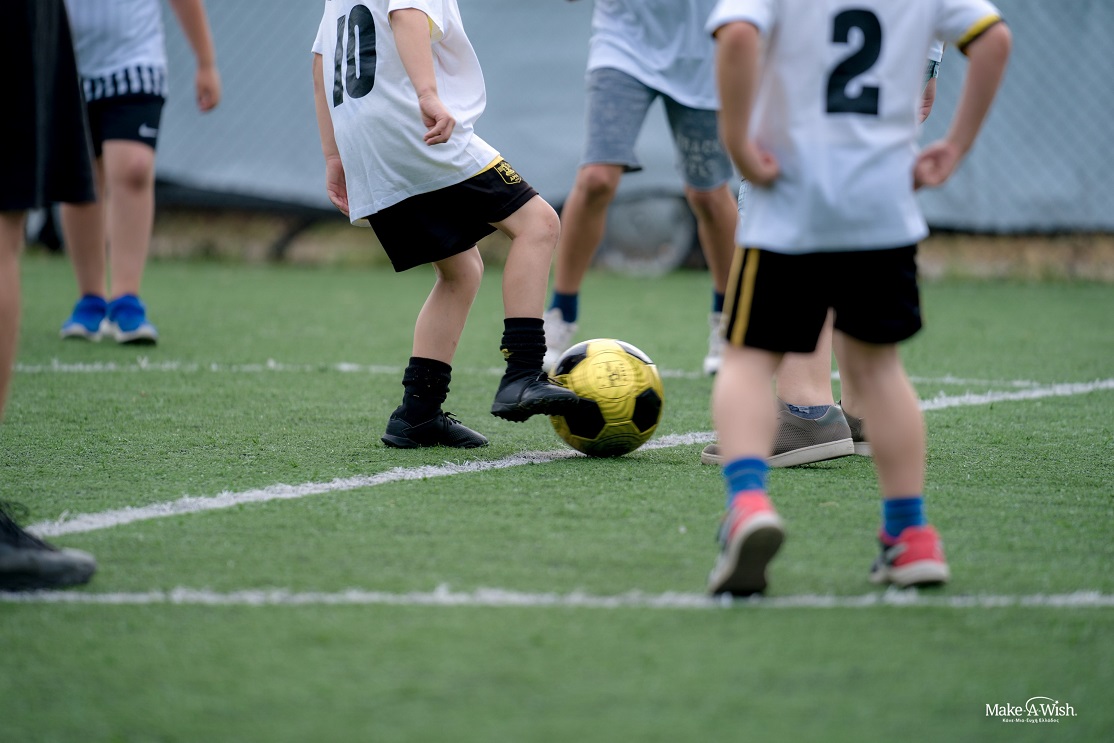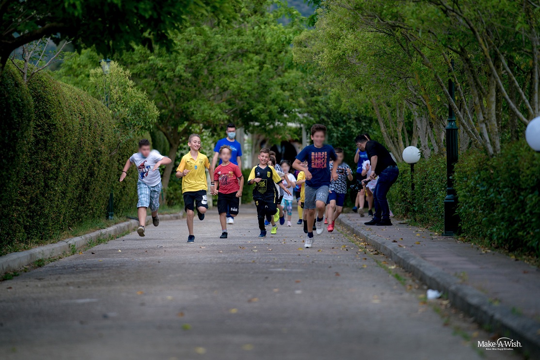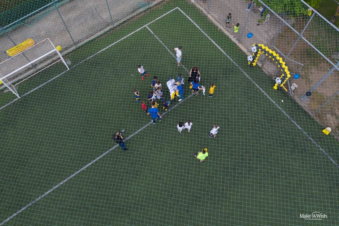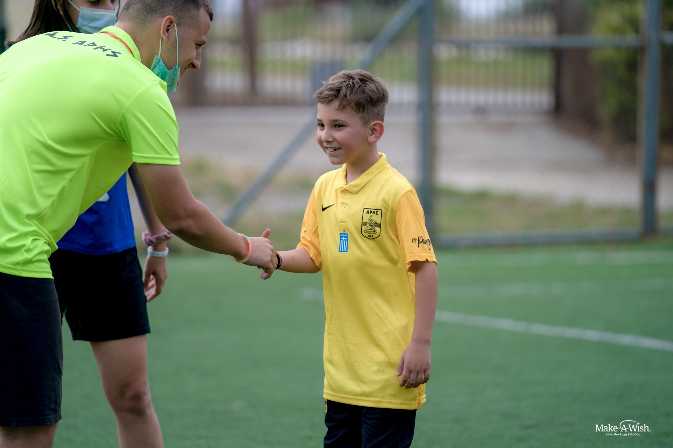 Πρώτος – πρώτος ο Γιάννης-Μάριος φόρεσε την μπλούζα από την στολή με το όνομα του και το νούμερο 5 στην φανέλα του. Οι εθελοντές μας, μοίρασαν στους φίλους του τα μπλουζάκια τους. Μαζί με τα παιδιά μπλουζάκια φόρεσαν και ο μπαμπάς και η μαμά του, καθώς και η γιατρός του. Οι ομάδες χωρίστηκαν, ο διαιτητής σφύριξε την έναρξη και το ματς ξεκίνησε! Η χαρά του Γιάννη-Μάριου; Απερίγραπτη! Κυριολεκτικά πήδαγε από τον ενθουσιασμό του! Το πρώτο γκολ του αγώνα μπήκε από τον μπαμπά του Γιάννη-Μάριου.