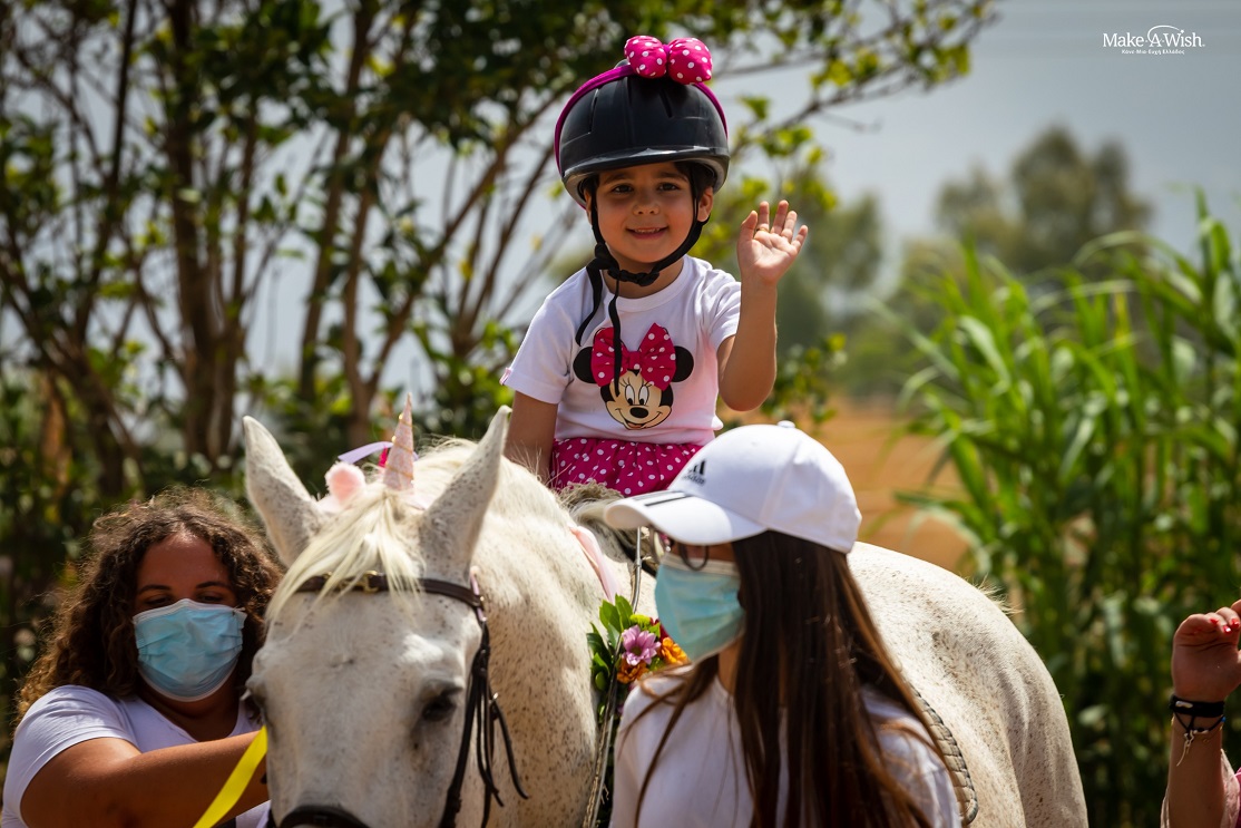Και να που τελικά έφτασε η μέρα που η Σταυρούλα, ντυμένη με τη στολή της αγαπημένης της Μίνυ Μάους, εμφανίστηκε μπροστά μας και αναπήδησε γεμάτη χαρά και ενθουσιασμό στο εκθαμβωτικό άλογο, το οποίο την περίμενε καρτερικά. Ήταν μια κανονική πριγκίπισσα!