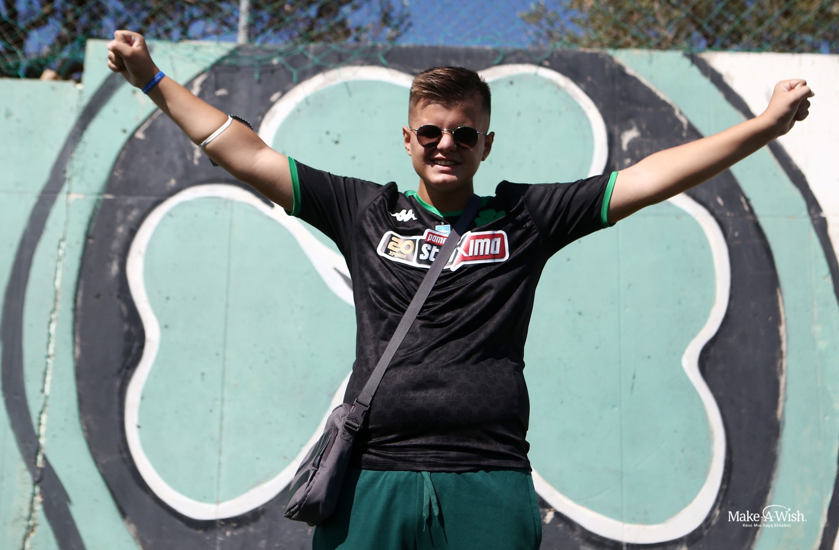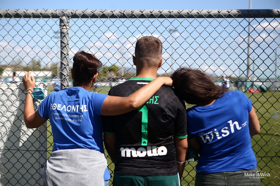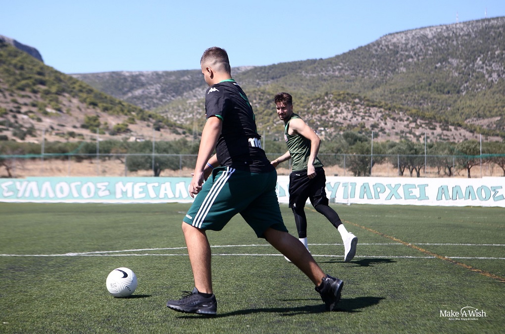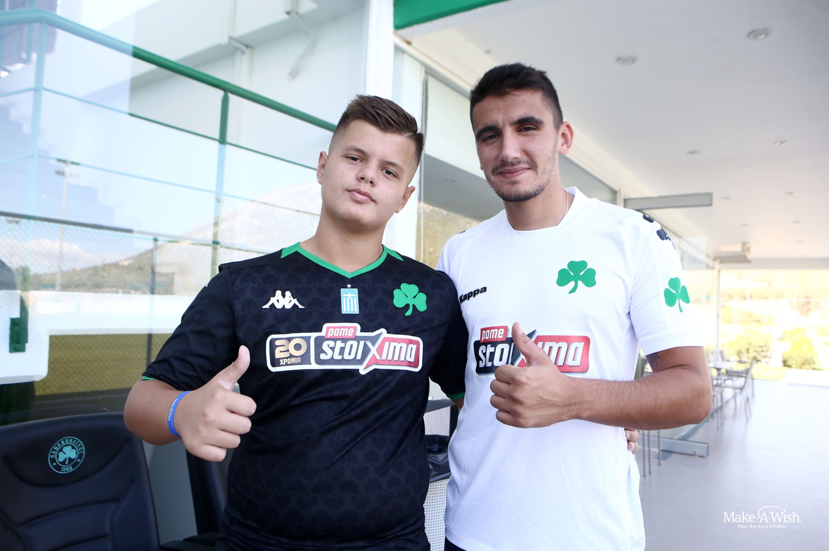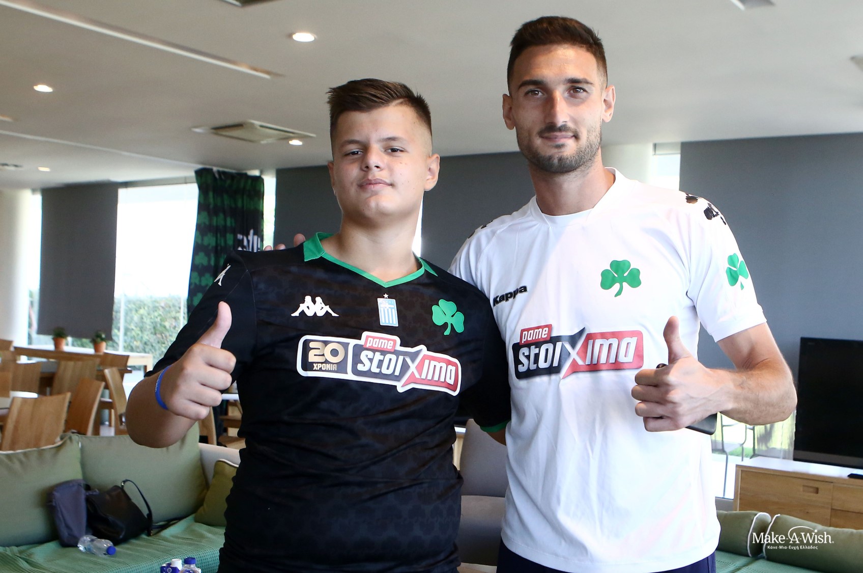 Η ευχή του Νίκου ξεκίνησε με την παραλαβή του ιδίου και της μητέρας του για να πάμε να παρακολουθήσουμε την προπόνηση του Παναθηναϊκού στο Κορωπί. Ο Νίκος φόρεσε την μπλούζα του Παναθηναϊκού, με την υπογραφή του αγαπημένου του Διούδη, και ξεκινήσαμε για την … αποστολή μας!