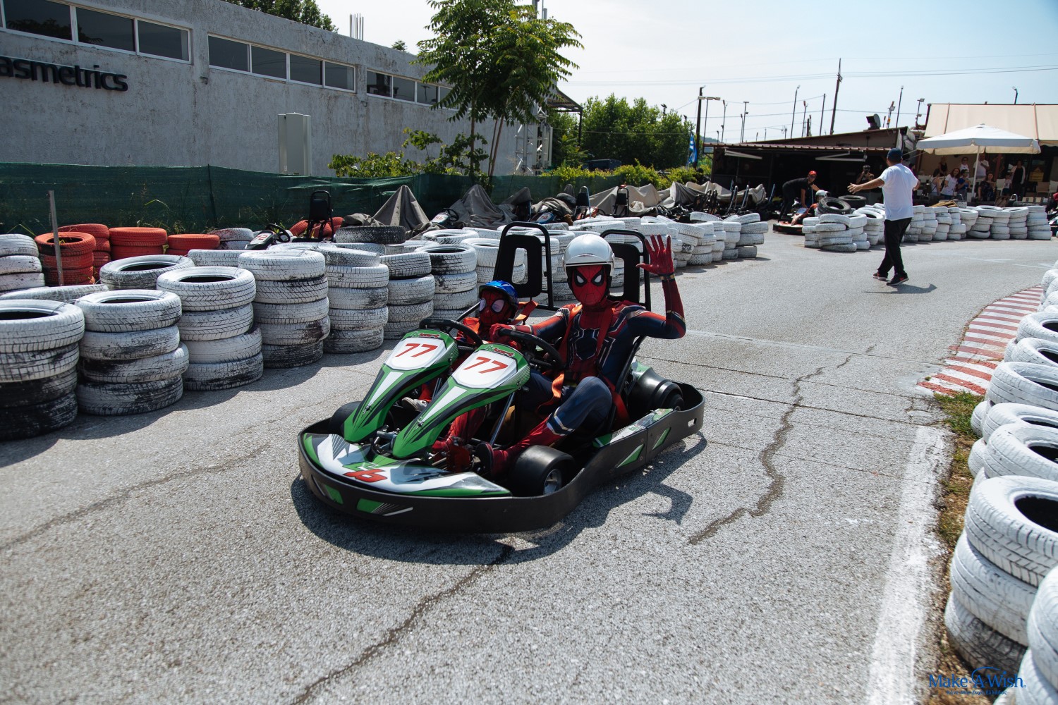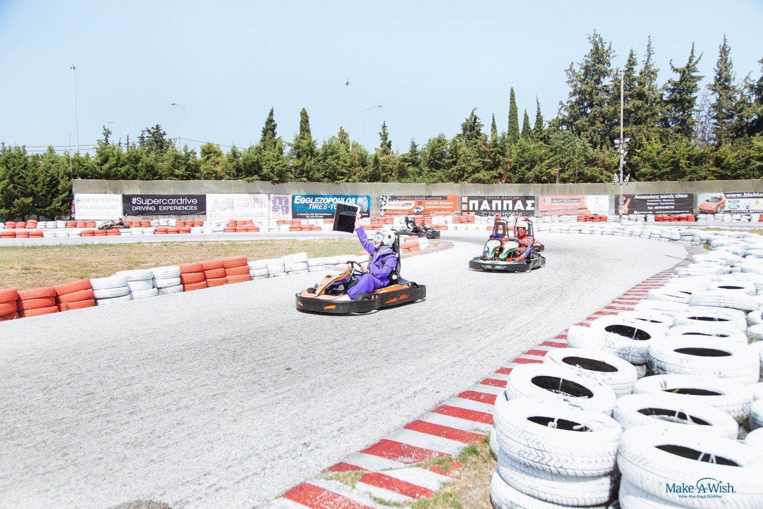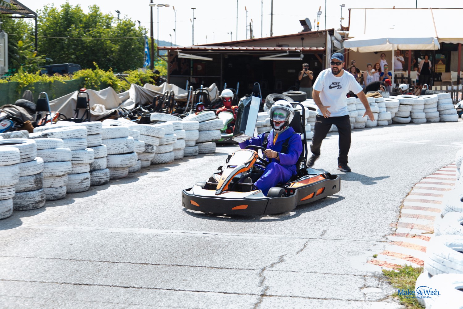 Ο ενθουσιασμός και οι συγκινήσεις της ημέρας είχαν κουράσει λίγο τον Γιώργο μας, αλλά με το που έφτασε στην πίστα καρτ, ξύπνησε μέσα του ο πολεμιστής! Έτρεξε να φορέσει τη στολή του και ήταν πανέτοιμος για μάχη!
