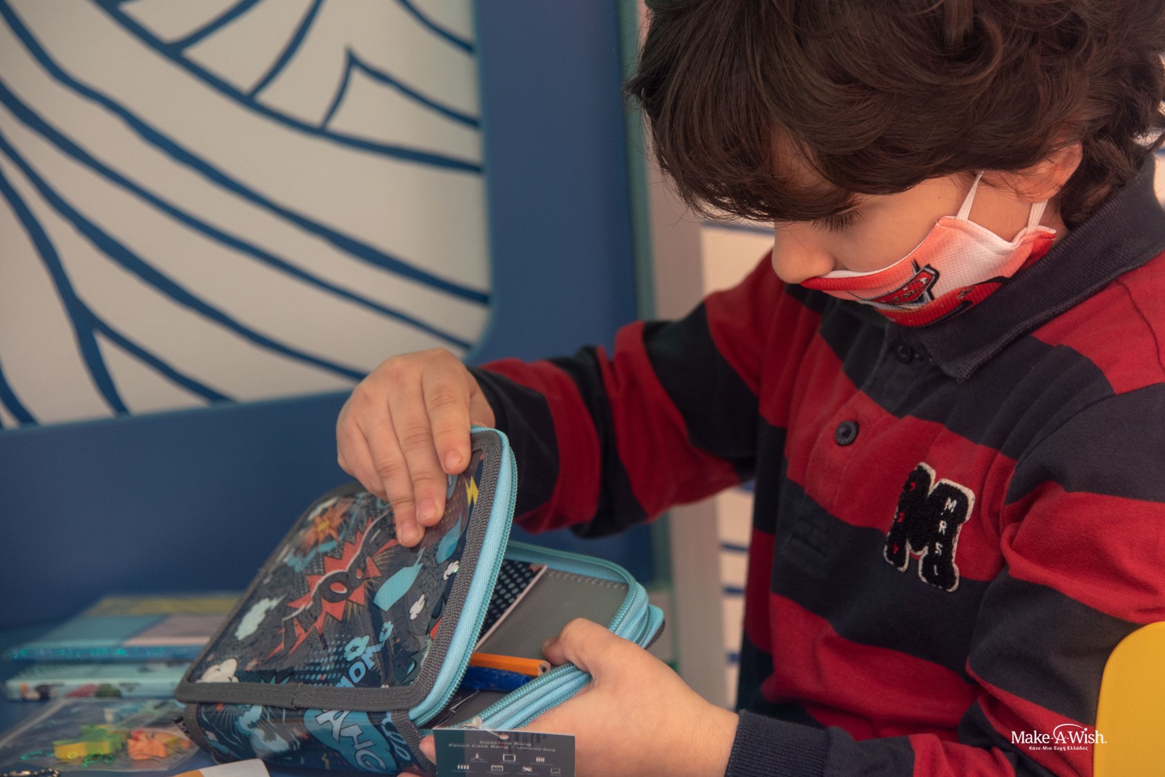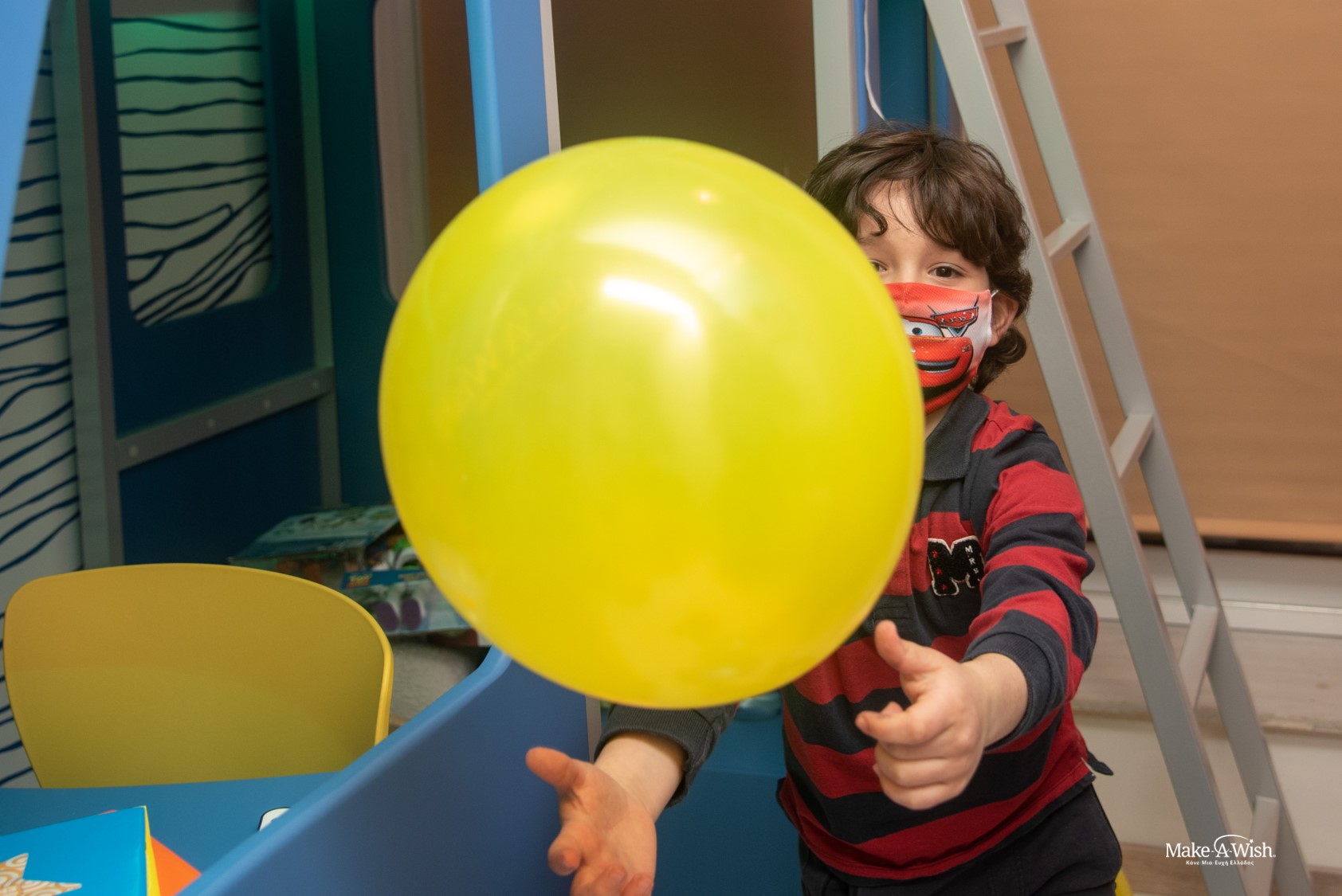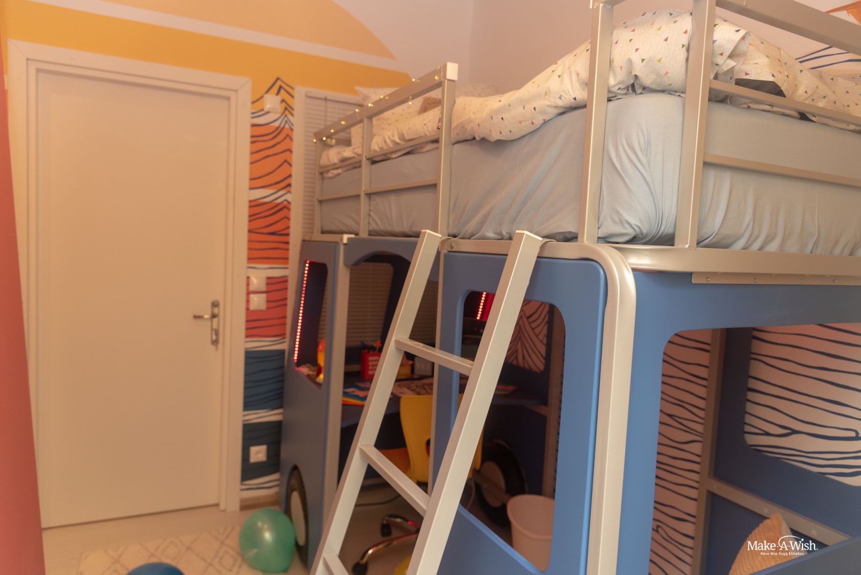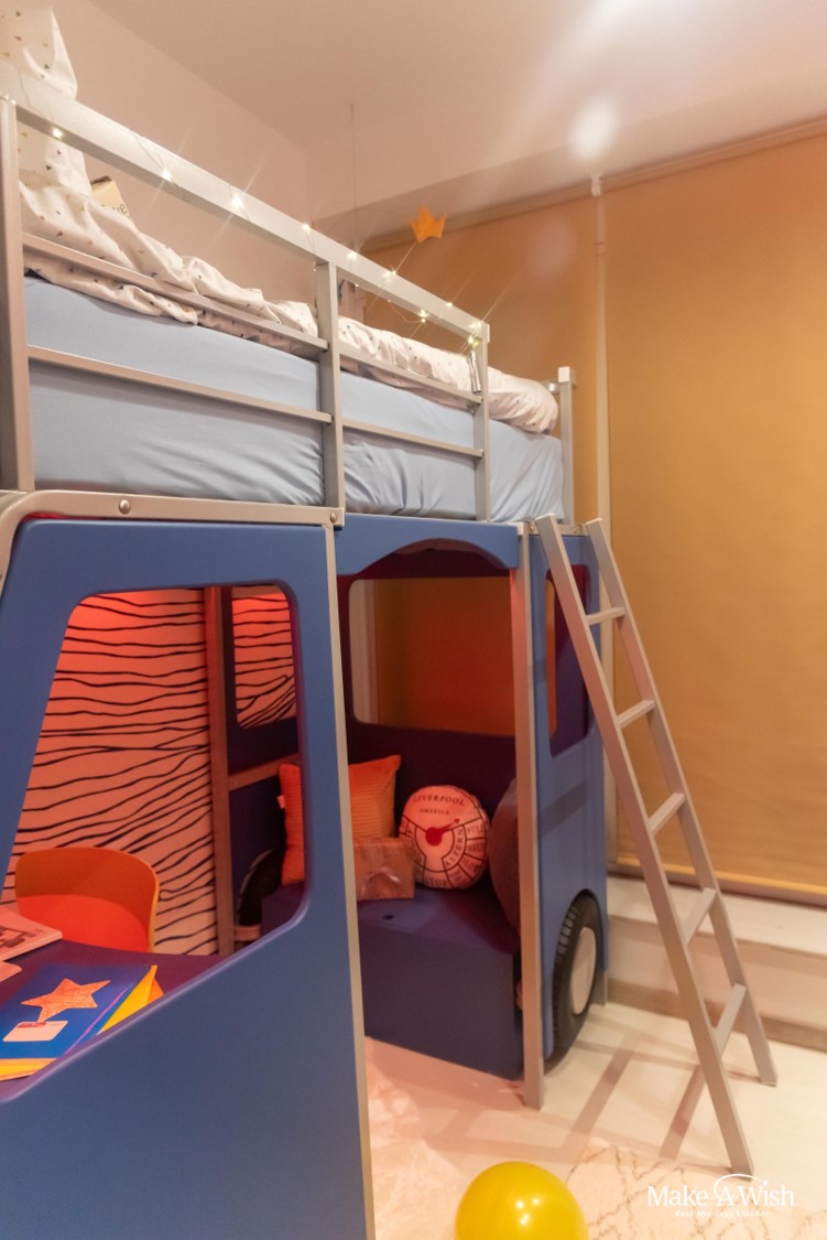 A wooden floor was laid, and the wall was decorated with a bright sun and painted with the warm colors of sunset…. with a wave popping right in front it. The scene was ready. The only thing left was the transformation of the blue track to a bed by the fairies. Even if you don’t believe us, Panagiotis can assure you that the wheel could really roll. And if this truck had already made a lot of trips, it now has reset the odometer and will write the most full and colorful kilometers with Panagiotis as its driver!