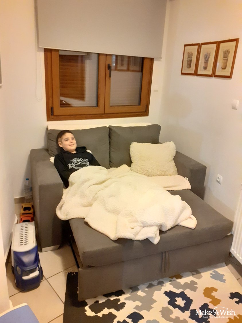 They looked around and decided that something needed to change. They chose a pretty and comfortable couch and warmed up the place with a big rug. Moreover, two modern blinds gave a special touch to Giannis’s room. Everything was ready and the fairies were truly nervous to see Giannis’s reaction. Their “compensation” came from the photos they received, with the lovely Giannis smiling and relaxing on his new sofa!