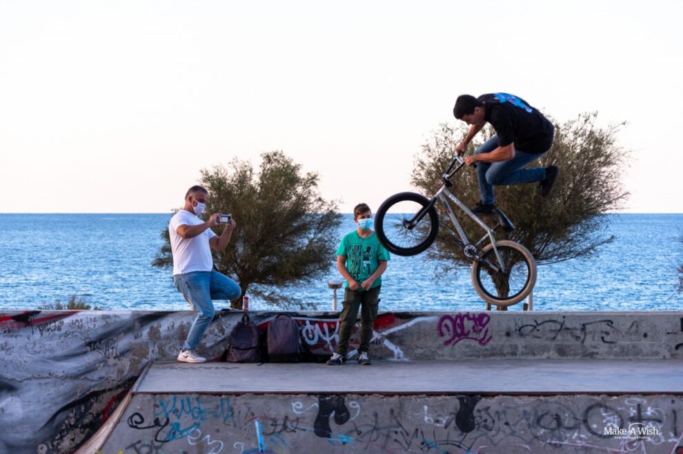 Moving on, we led him to a beautiful beach, where he watched a bmx show, in a custom-made track. He was impressed! The highlight of the experience was Konstantinos doing tricks on the bike! His talent thrilled us! This unforgettable day ended when he arrived home, where except from the gaming package, a huge cake and some delicious pizzas were waiting for him. His mother informed us that Konstantinos, very excited and with a full stomach, stayed awake till 1am in the morning, not being able to realize how wonderful and ideal was the granting of his wish. More specifically, as we were told, his exact words were: “I was sure that my wish was going to be amazing, however, I had never imagined all of this… Finally! I can bring my friends over! You can’t imagine how happy I am. Everything is perfect!!!”