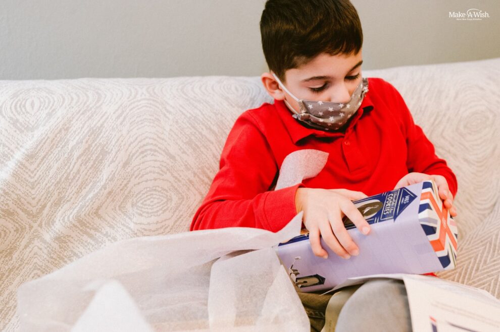 The whole team of Make-a-Wish and Ms. Sfakianakis wished Spyros a happy birthday! Even though he was a little shy, our little guy was so excited! However, the surprises didn’t stop there. His favorite fairy, that organized wonderfully all of this, didn’t forge to give him a taste of his first wish. She had prepared for him a box with delicious treats from Scotland and a gorgeous card! Spyros, thrilled, processed everything one by one and shared cookies and chips with his siblings and his friend!