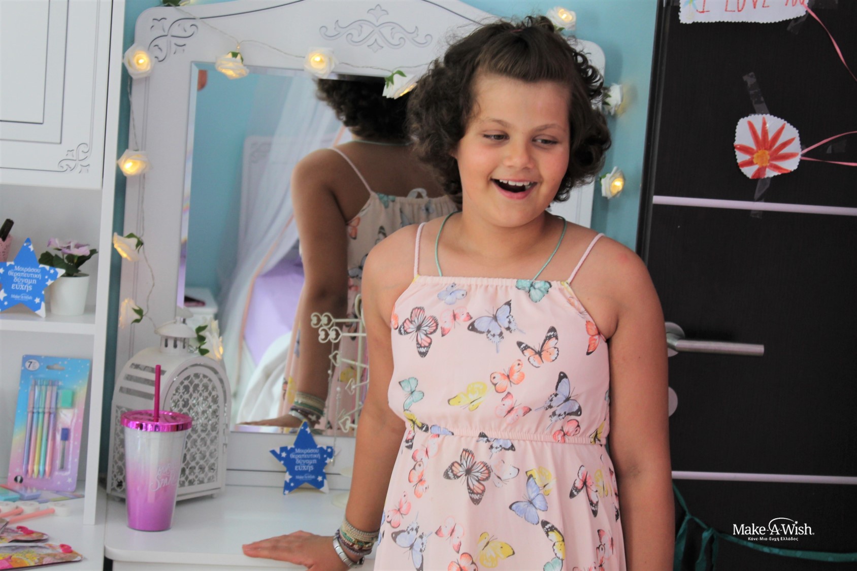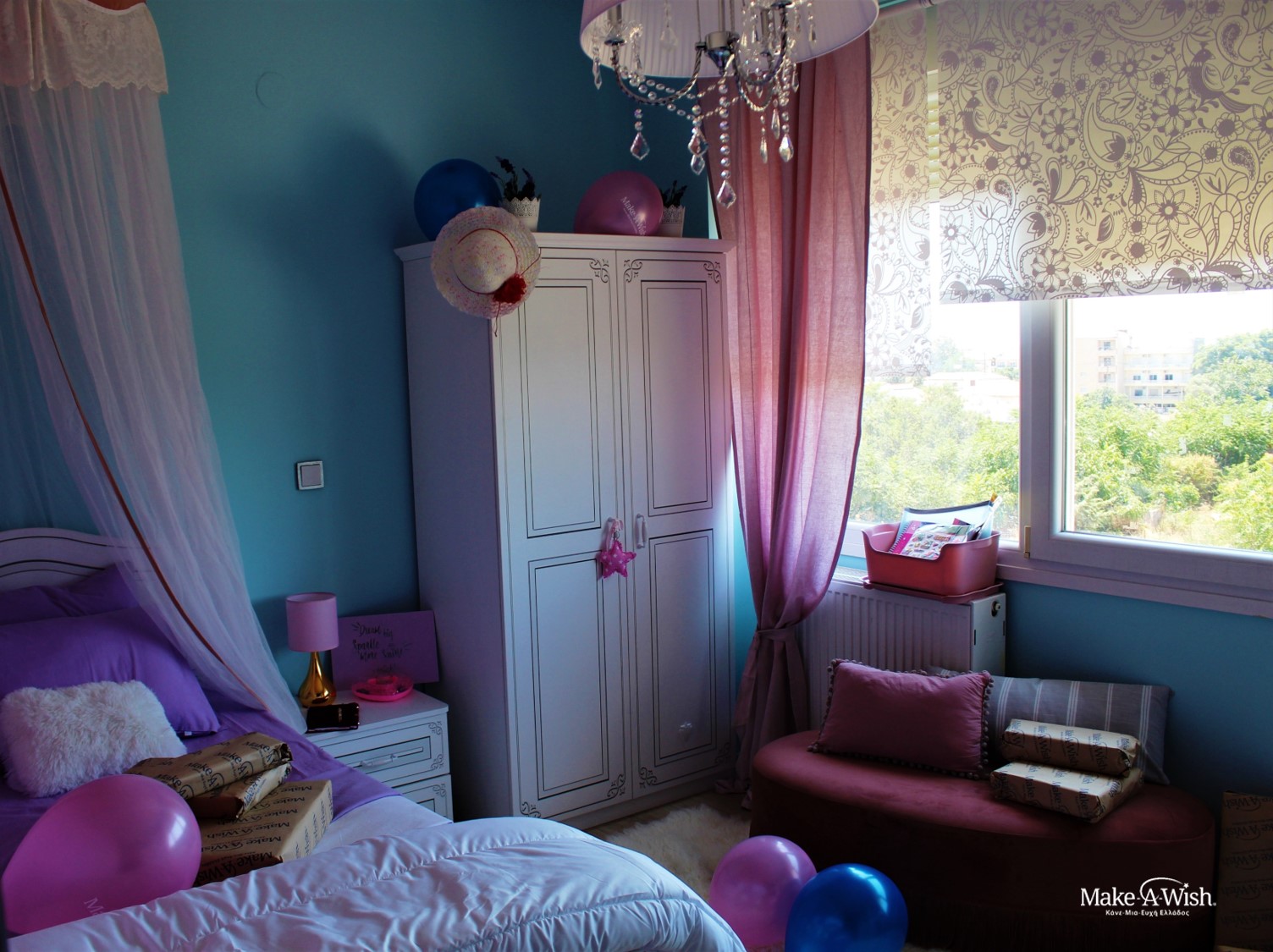 Anastasia is a very communicative and talented kid. Full of experiences, she’s even been to America plenty of times, as she loves travelling! Therefore, we wouldn’t be able to predict her wish, as she could ask anything from the fairies of Make-A-Wish. She needed to be patient to meet them, as her treatments and health condition didn’t allow her to do so. She had to prepare herself mentally and physically for the greatest gift of all: a transplant. The right moment, though, came and the fairies received a drawing of her wish: a brand new room! After a lot of research, she had already chosen herself the furniture she wanted her new room to be decorated with. The concept was romantic, as her favorite colors, pink, baby blue and lilah, were flooding the room! She had already a lot of toys and dolls, especially Barbie dolls, which are her favorite, so she kindly asked from the fairies to keep in mind placing some shelves for her them and a rug in the middle of the room so that she can play with her friends.