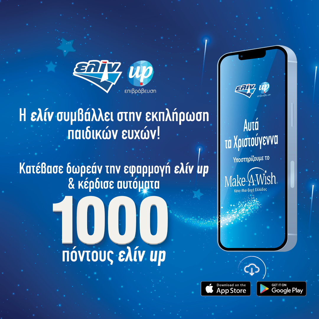 Κατεβάζοντας την εφαρμογή ελίν up δωρεάν σε Android ή iOS κινητό, η ελίν συμβάλλει στην εκπλήρωση των ευχών των παιδιών που έχουν ανάγκη τη στήριξή μας. Mε το download, οι χρήστες κερδίζουν αυτόματα 1.000 πόντους «ελίν up», ενώ γίνονται μέλη συλλέγοντας πόντους με κάθε αγορά αγορά καυσίμων, λιπαντικών, αλλά και ηλεκτρικού ρεύματος και φυσικού αερίου που μπορούν να εξαργυρώσουν σε δώρα ή δωροεπιταγές ελίν.