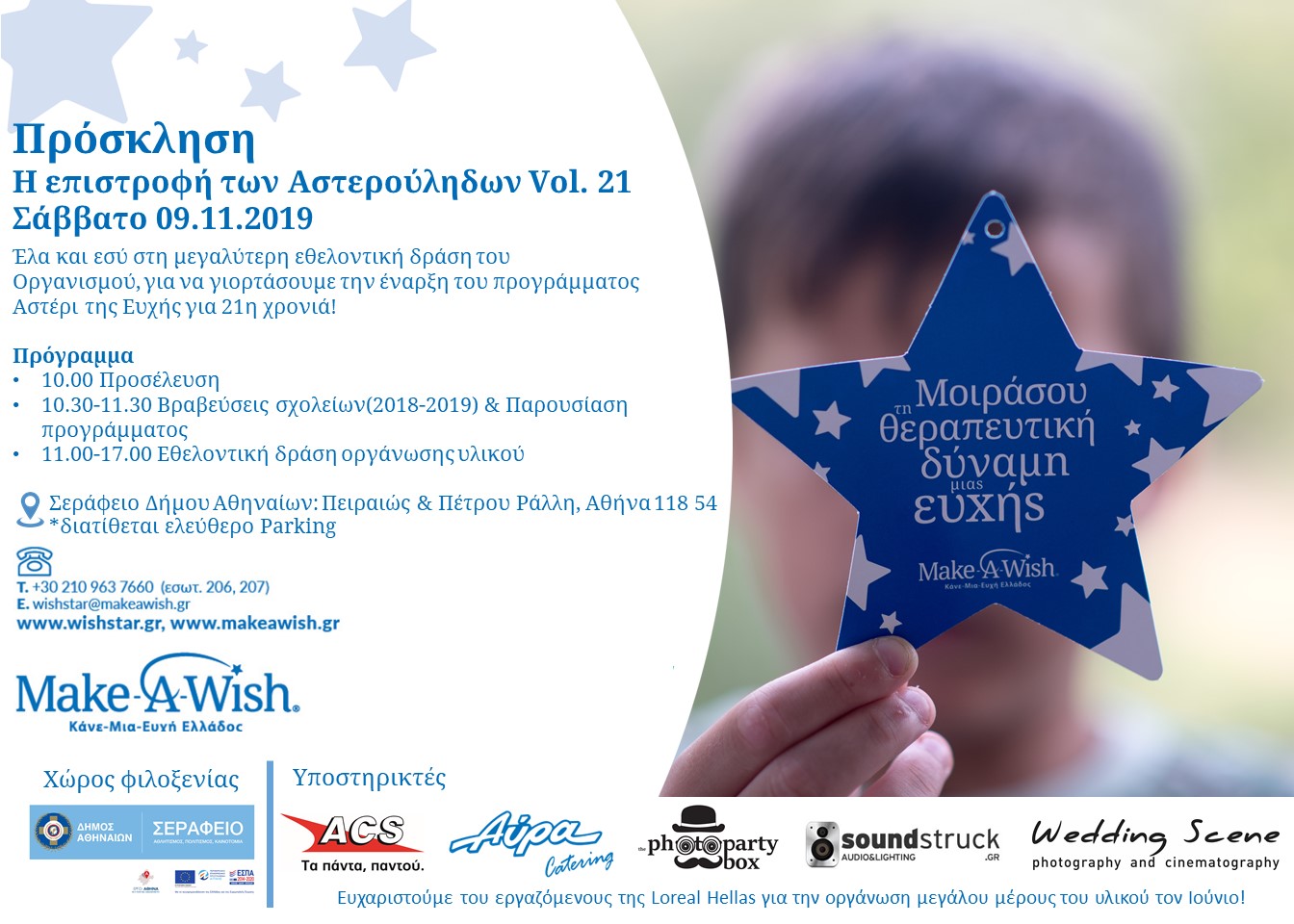 Σας περιμένουμε στη μεγαλύτερη εθελοντική δράση του Make-A-Wish (Κάνε-Μια-Ευχή Ελλάδος), για να γιορτάσουμε την έναρξη των εργασιών για την υλοποίηση του προγράμματος Αστέρι της Ευχής για 21η χρονιά!