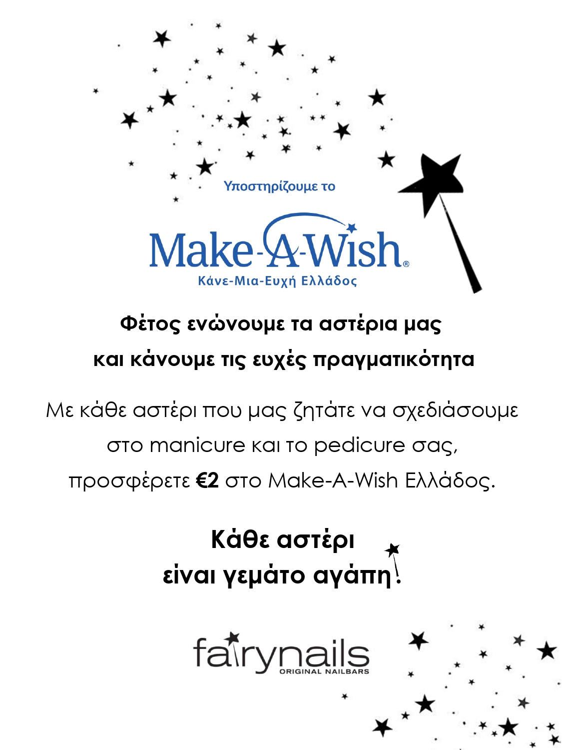 Η Fairynails υποστηρίζει το Make-A-Wish (Κάνε-Μια-Ευχή Ελλάδος) που εκπληρώνει την ευχή κάθε παιδιού ηλικίας 3-18 ετών που πάσχει από μία σοβαρή ασθένεια. Τι πιο όμορφο από το να συμβάλλουμε και εμείς σε αυτή την προσπάθεια και να βοηθήσουμε το Make-A-Wish Ελλάδος να εκπληρώσει ακόμη περισσότερες ευχές και να κάνει τα όνειρα αυτών των παιδιών πραγματικότητα; Μία μικρή κίνηση από όλους μας είναι και αυτή που μπορεί να αλλάξει τα πάντα.