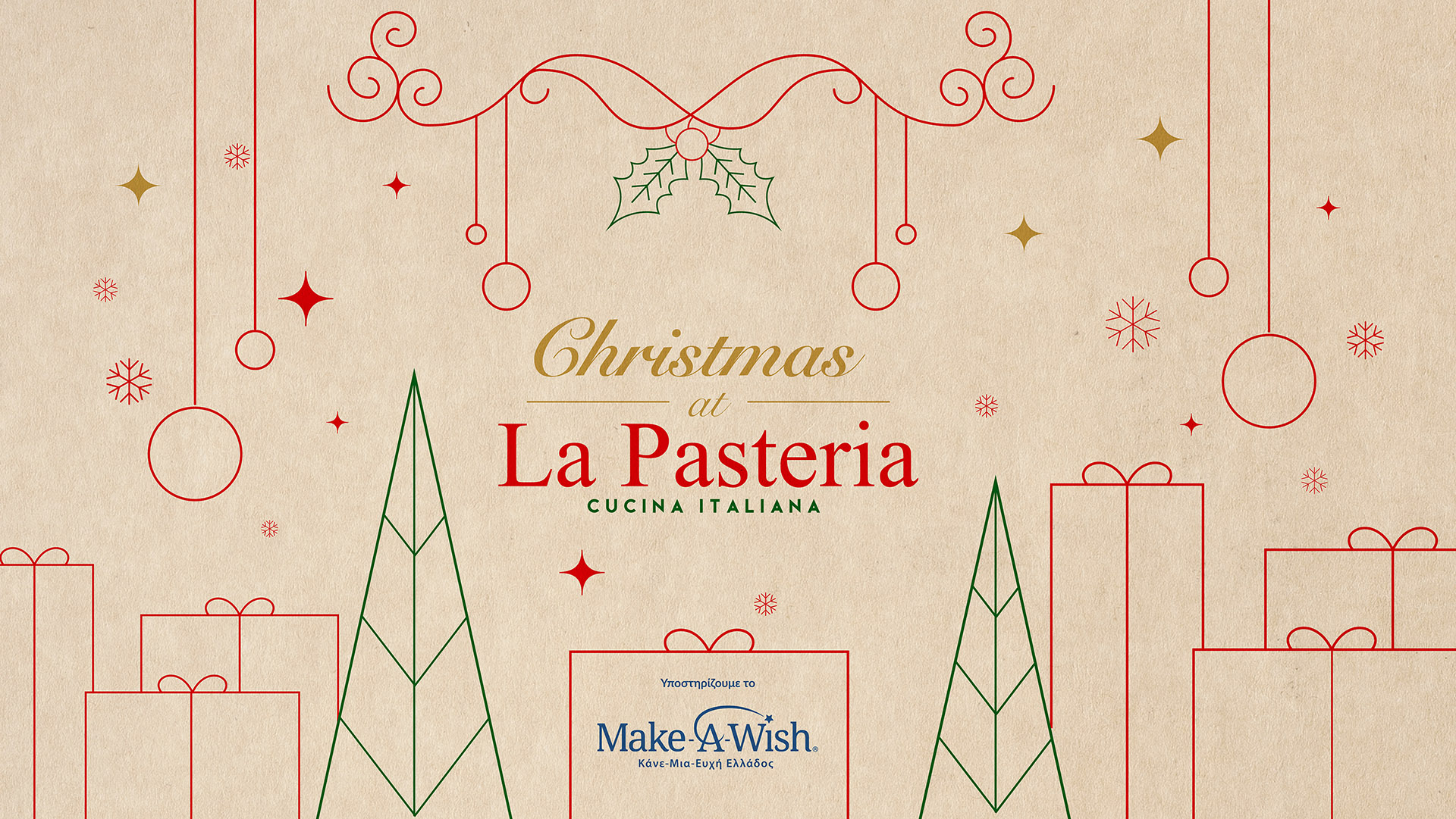 Φέτος τα Χριστούγεννα, η La Pasteria σάς φέρνει πιο κοντά στα παιδιά που χρειάζονται τη βοήθειά μας, επεκτείνοντας την παραπάνω υποστήριξη. Με την αγορά κάθε πιάτου από το Χριστουγεννιάτικο menu, η La Pasteria υποστηρίζει την εκπλήρωση ευχών σε παιδιά που πάσχουν από σοβαρές ασθένειες. Με αυτό τον τρόπο ενισχύεται το σημαντικό έργο του Make-A-Wish Ελλάδος με στόχο να δώσει ακόμα περισσότερη χαρά, δύναμη και ελπίδα στον αγώνα των παιδιών.
