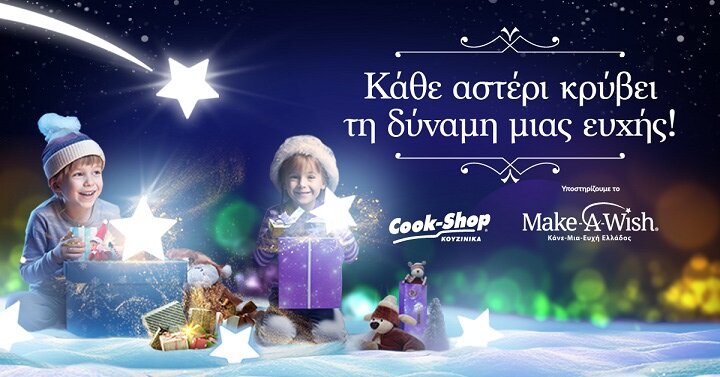 Το 2023 το Cook–Shop στήριξε για 3η συνεχή χρονιά, το έργο του Make–A–Wish (Κάνε-Μια-Ευχή Ελλάδος), προσφέροντας στους καταναλωτές ένα «Αστέρι της Ευχής» για κάθε αγορά προϊόντων από 50€. Μπείτε στο άρθρο και μάθετε περισσότερα!