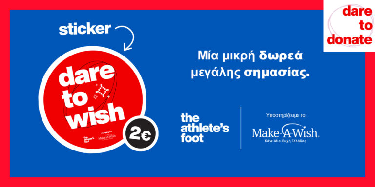 Φέτος, η The Athlete’s Foot υποστηρίζει το έργο του Make-A-Wish (Κάνε-Μια-Ευχή Ελλάδος) με το αυτοκόλλητο “Dare To Wish” , το οποίο διατίθεται στην συμβολική τιμή 2€ και τα έσοδα που θα συγκεντρωθούν θα διατεθούν εξ ολοκλήρου στη στήριξη του έργου του οργανισμού.