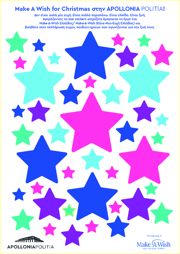 Η Apollonia Politia Hondos Center, φέτος τα Χριστούγεννα στηρίζει έμπρακτα το έργο του Make–A–Wish (Κάνε-Μια-Ευχή Ελλάδος). Kαρτέλες με πολύχρωμα αυτοκόλλητα / αστέρια θα δημιουργήσουν μία βιωματική εμπειρία και ένα μαγικό και άκρως multicolored αποτέλεσμα στον ειδικά διαμορφωμένο χώρο.