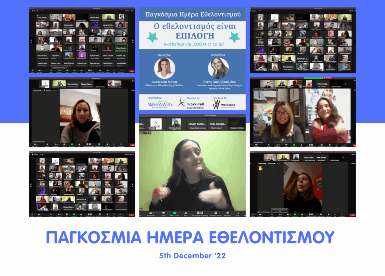 Την Πέμπτη, 5 Δεκεμβρίου, Παγκόσμια Ημέρα Εθελοντισμού, το Make-A-Wish (Κάνε-Μια-Ευχή Ελλάδος) πραγματοποίησε για πρώτη φορά ένα online διαδραστικό workshop. Το workshop εισηγήθηκαν οι Αναστασία Μανιά, εθελόντρια του οργανισμού τα τελευταία 22 χρόνια, και η Ντέπη Χατζηβασιλείου, καταξιωμένη στον χώρο και ιδρύτρια της WorkWise.
