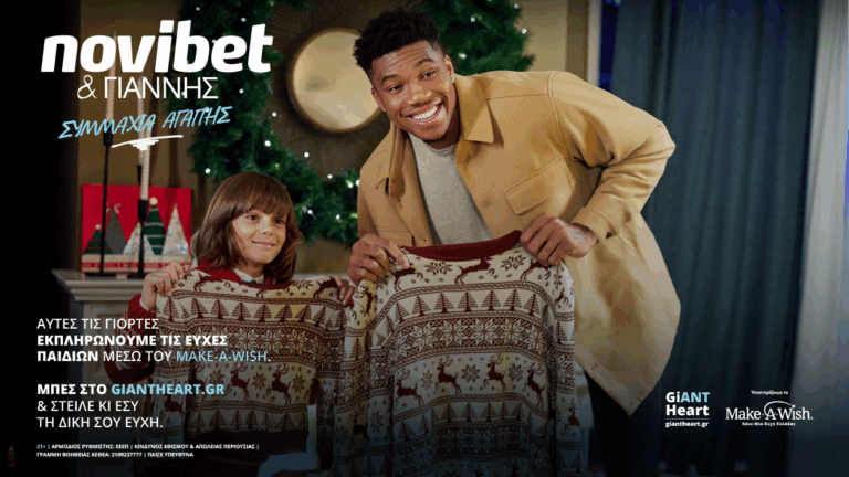 H Novibet μέσω του προγράμματος “The GiANT Heart” με πρεσβευτή τον Γιάννη Αντετοκούνμπο, προχωράει φέτος τα Χριστούγεννα σε μια Συμμαχία Αγάπης με τον οργανισμό Make-A-Wish (Κάνε-Μια-Ευχή) Ελλάδος, συμβάλλοντας στην εκπλήρωση 6 ευχών παιδιών με σοβαρές ασθένειες.