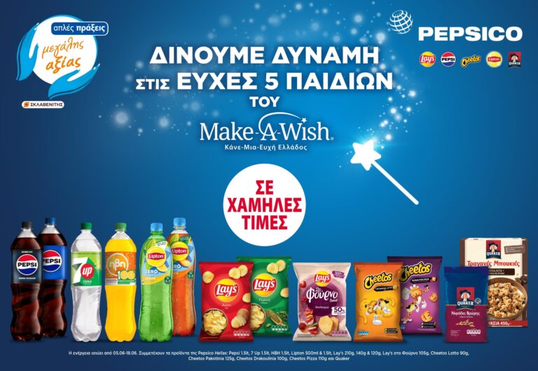 ️ Από 5 έως 18 Ιουνίου, αποκλειστικά στα καταστήματα Σκλαβενίτης σε όλη την Ελλάδα, η Pepsico με την αγορά επιλεγμένων προϊόντων, δίνει δύναμη στις ευχές 5 παιδιών του Make-A-Wish (Κάνε-Μια-Ευχή Ελλάδος).