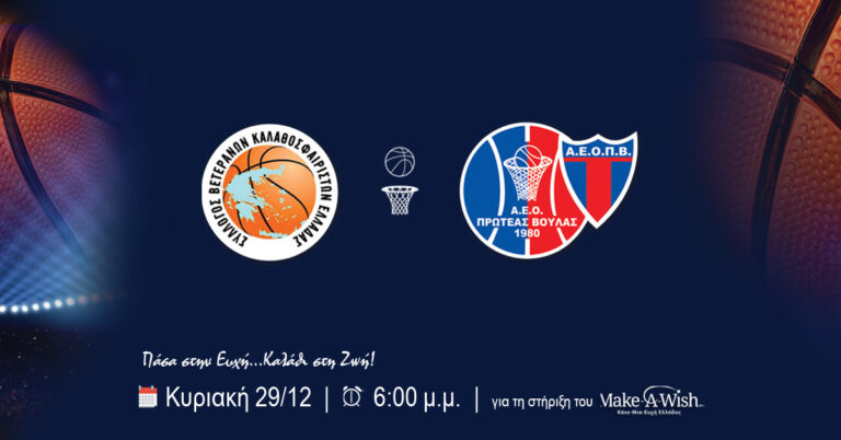 Tnν Κυριακή 29 Δεκεμβρίου & ⌚ώρα 6:00, στο κλειστό Γυμναστήριο Βούλας, θα διεξαχθεί ο φιλανθρωπικός αγώνας “Πάσα στην Ευχή…Καλάθι στη Ζωή”, μεταξύ του Α.Ε.Ο. Πρωτέας Βούλας και των Βετεράνων καλαθοσφαιριστών Ελλάδας, για την ενίσχυση του Make-A-Wish (Κάνε-Μια-Ευχή Ελλάδος)
