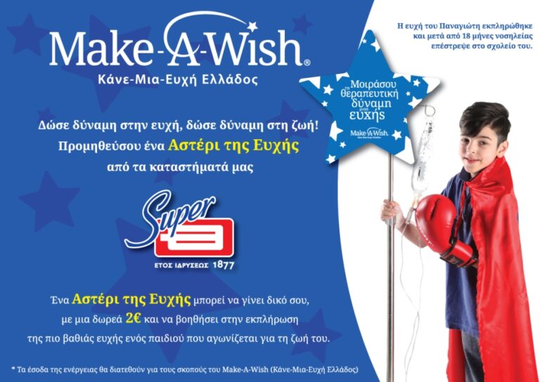 Δώσε κι εσύ δύναμη στην EYXH προμηθεύσου ένα ΑΣΤΕΡΑΚΙ «Make-A-Wish» από τα 20 καταστήματα Cosmos Sport στη συμβολική τιμή των 2€. Ελάτε να εκπληρώσουμε τις Ευχές των ΠΑΙΔΙΩΝ που δίνουν έναν απαιτητικό αγώνα για τη ζωή τους και θέλουμε όλοι, να βγουν νικητές! ⭐
