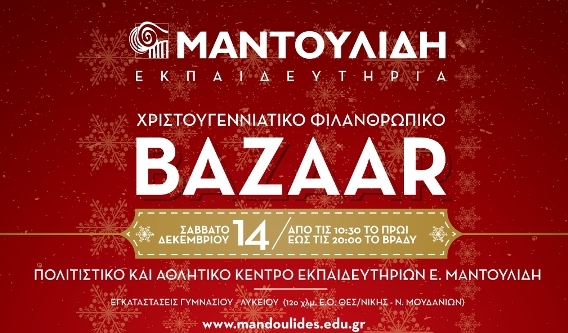 Τα Εκπαιδευτήρια Ε. Μαντουλίδη και ο Μορφωτικός Αθλητικός Σύλλογος ΕΥΑΓΓΕΛΟΣ ΜΑΝΤΟΥΛΙΔΗΣ διοργανώνουν το Σάββατο, 14 Δεκεμβρίου 2019, Χριστουγεννιάτικο Φιλανθρωπικό Bazaar, από τις 10:30 το πρωί έως τις 20:00 το βράδυ, στο Πολιτιστικό και Αθλητικό Κέντρο των Εκπαιδευτηρίων στις εγκαταστάσεις του Γυμνασίου – Λυκείου.