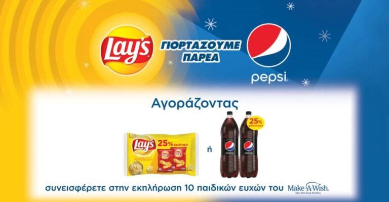 H PepsiCo στέκεται δίπλα στον Οργανισμό μας αυτά τα Χριστούγεννα , υλοποιώντας την πρωτοβουλία “Γιορτάζουμε Παρέα” και συμβάλει στην εκπλήρωση 10 ευχών παιδιών με πολύ σοβαρές ασθένειες.
