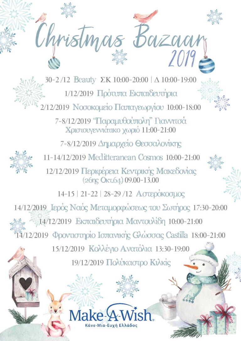 Θα χαρούμε να σας έχουμε κοντά μας σε όποιο σημείο πώλησης σάς εξυπηρετεί, στα Χριστουγεννιάτικα bazaar που διοργανώνουμε στη Θεσσαλονίκη για να προμηθευτείτε Χριστουγεννιάτικα στολίδια, γούρια, και δώρα, φτιαγμένα με αγάπη και πολύ μεράκι από τους εθελοντές μας.