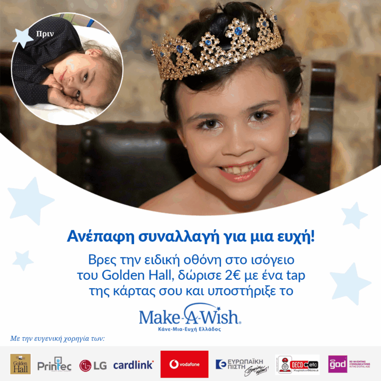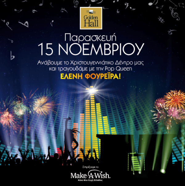 Στις 15 Νοεμβρίου, στις 17:30 το απόγευμα, το Golden Hall φωτίζει το χριστουγεννιάτικο δέντρο του και μας προσκαλεί σε μία ξεχωριστή βραδιά, αφιερωμένη στο Make-A-Wish (Κάνε-Μια-Ευχή Ελλάδος).