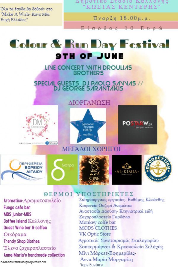 Το Σάββατο 9 Ιουνίου διοργανώνεται στην Καλλονή Λέσβου, το Colour & Run Day Festival, για την υποστήριξη του Make-A-Wish (Κάνε-Μια-Ευχή Ελλάδος).