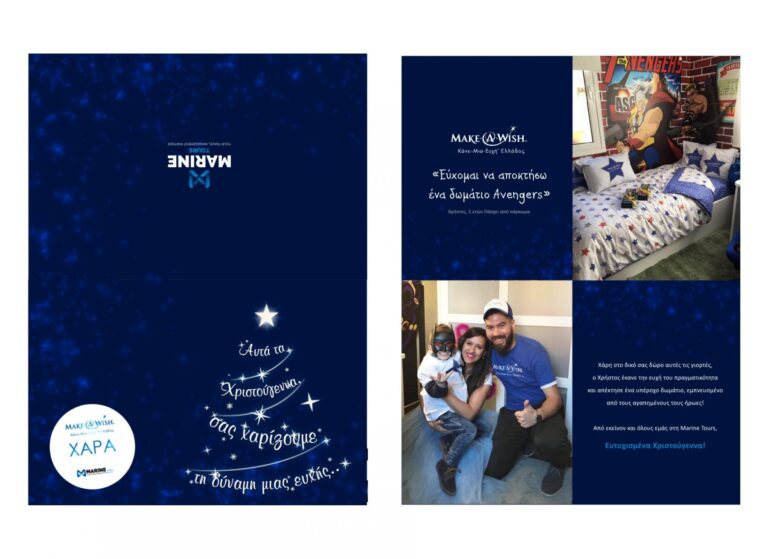 Η Marine Tours μοίρασε απλόχερα… μαγεία αντί δώρων… τις φετινές γιορτές σε φίλους, πελάτες και συνεργάτες της! Προσφέροντας το σύνολο της αξίας των επιχειρηματικών δώρων της στο Make-A-Wish (Κάνε-Μια-Ευχή Ελλάδος), κατάφερε να κάνει πραγματικότητα τις ευχές 3 παιδιών που νοσούν από σοβαρές ασθένειες, υποστηρίζοντας τον αγώνα ζωής που δίνουν καθημερινά.