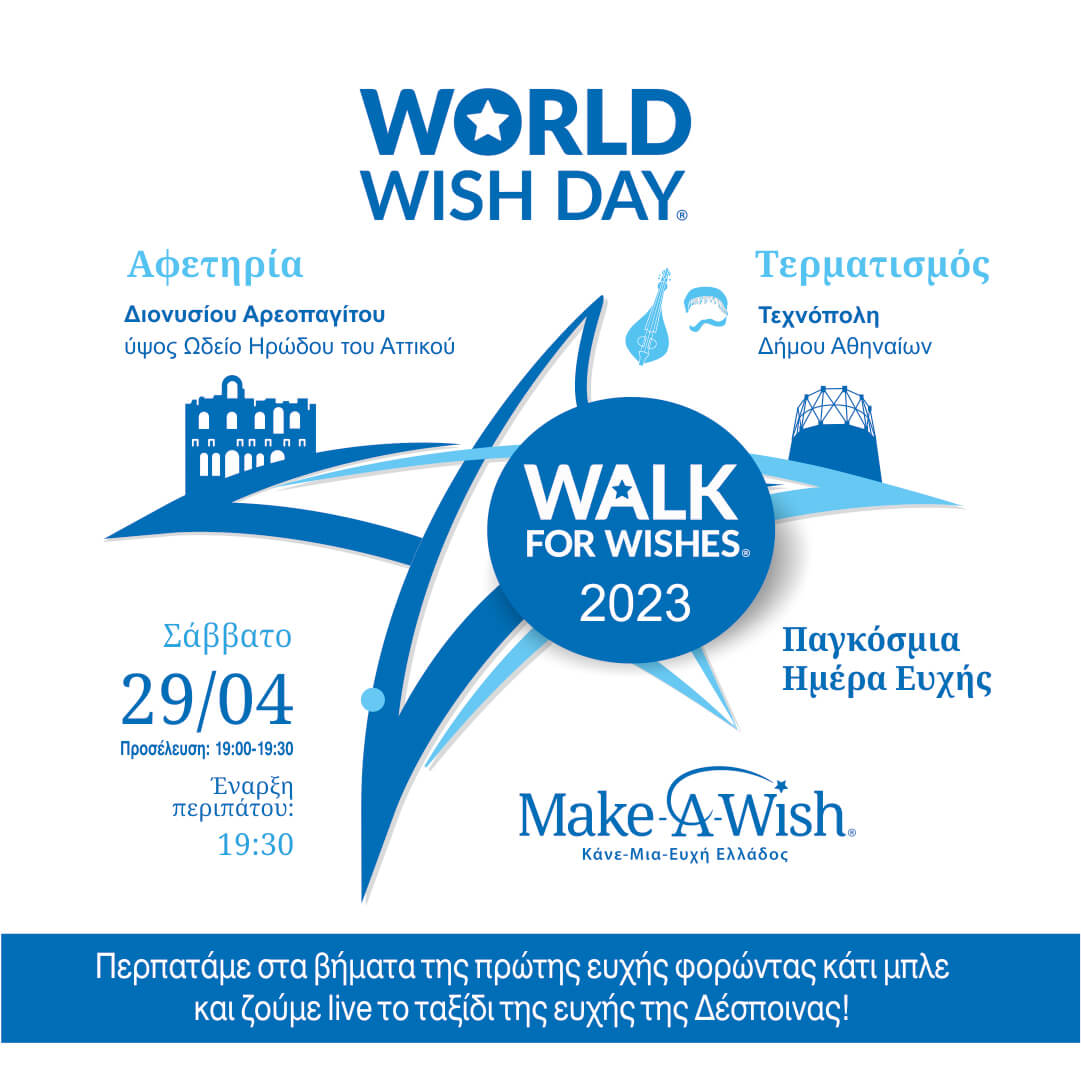 Το Make-A-Wish (Κάνε-Μια-Ευχή Ελλάδος) γιορτάζει στις 29 Απριλίου την Παγκόσμια Ημέρα Ευχής με τον καθιερωμένο, ετήσιο, περίπατο Walk for Wishes στο κέντρο της Αθήνας! Όπως κάθε χρόνο, εθελοντές, οικογένειες ευχής και φίλοι του οργανισμού θα περπατήσουν στα βήματα της πρώτης ευχής, αυτής του Chris, φορώντας κάτι μπλε, και θα γιορτάσουν την επέτειο των 43 ετών του παγκόσμιου οργανισμού, σε «παραδοσιακό» ρυθμό!