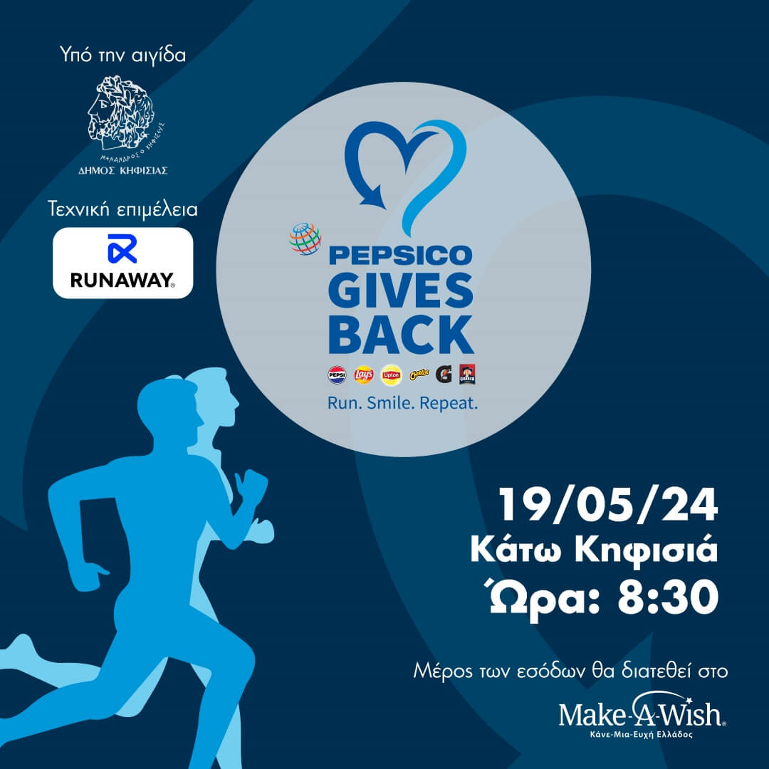 Η PepsiCo Hellas διοργανώνει για πρώτη φορά Αγώνες Δρόμου, υπό την αιγίδα του Δήμου Κηφισιάς, με την τεχνική επιμέλεια της RUNAWAY και σε συνεργασία με τον Πανελλήνιο Πρωταθλητή δίαθλου Γρηγόρη Σκουλαρίκη και σας περιμένει την Κυριακή 19 Μαΐου σε ένα αθλητικό γεγονός με πολλές εκπλήξεις και έναν σημαντικό σκοπό· να στηρίξει το έργο της ΜΚΟ Make-A-Wish Ελλάδος.