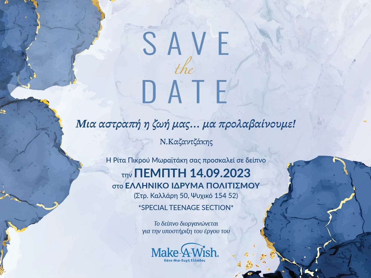 Το δείπνο θα πραγματοποιηθεί την Πέμπτη 14 Σεπτεμβρίου στις 19.30 στο Ελληνικό Ίδρυμα Πολιτισμού (Στρ. Καλλάρη 50, Ψυχικό, 15452) και μέρος των εσόδων της εκδήλωσης θα διατεθεί υπέρ των σκοπών του Make-A-Wish (Κάνε-Μια-Ευχή Ελλάδος).